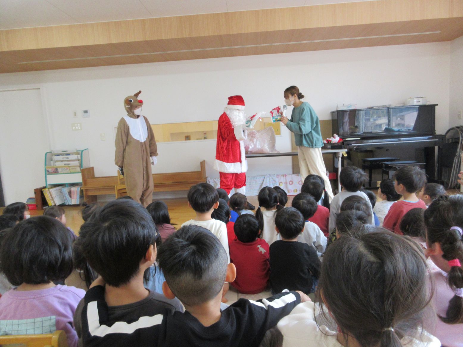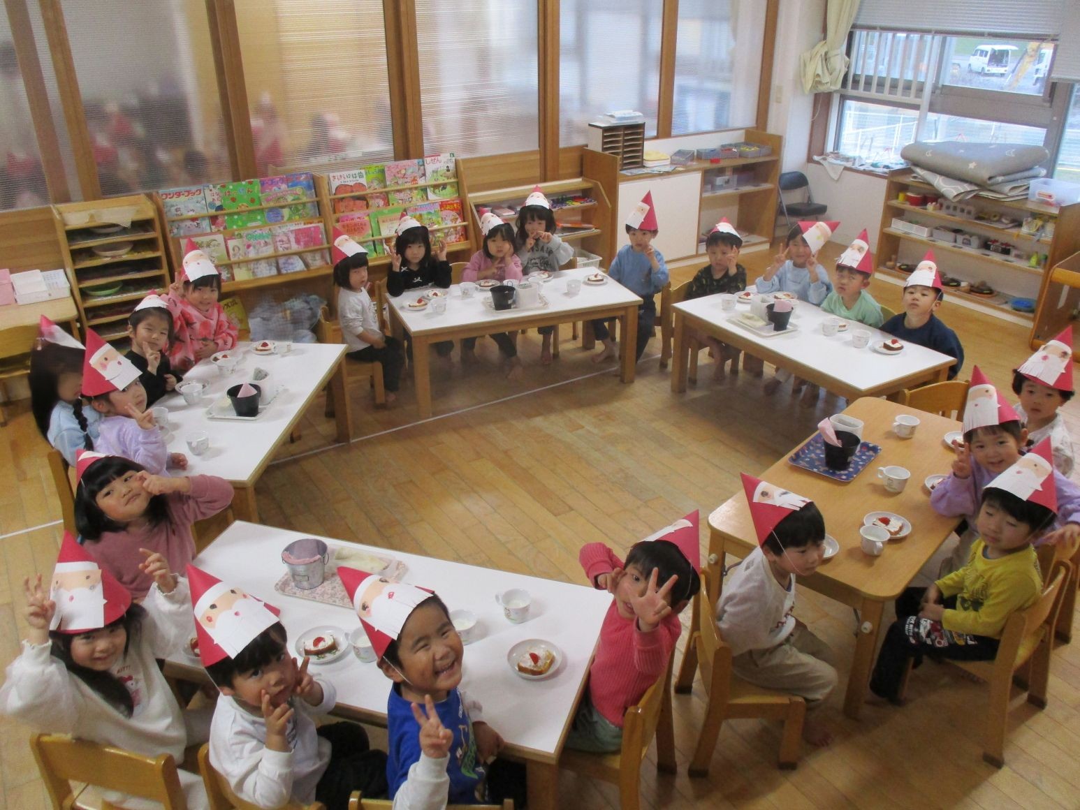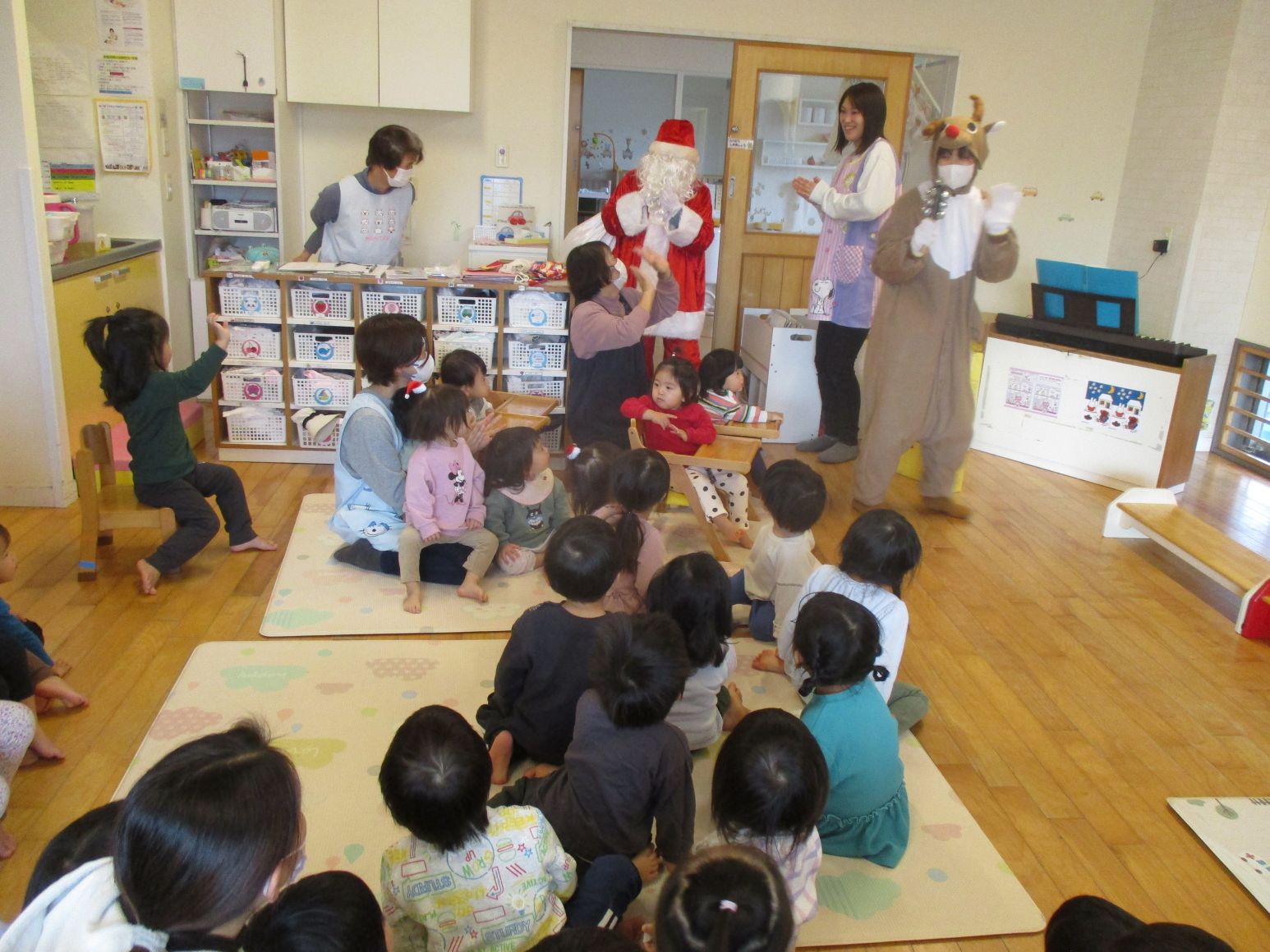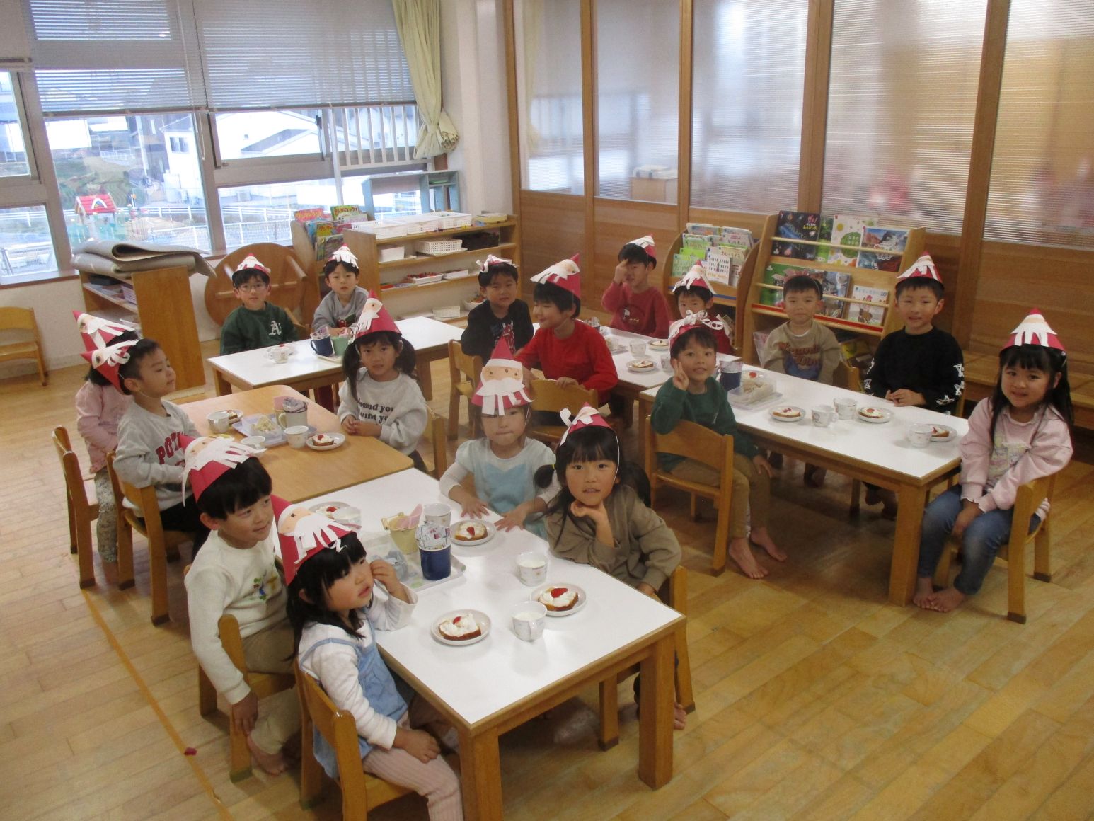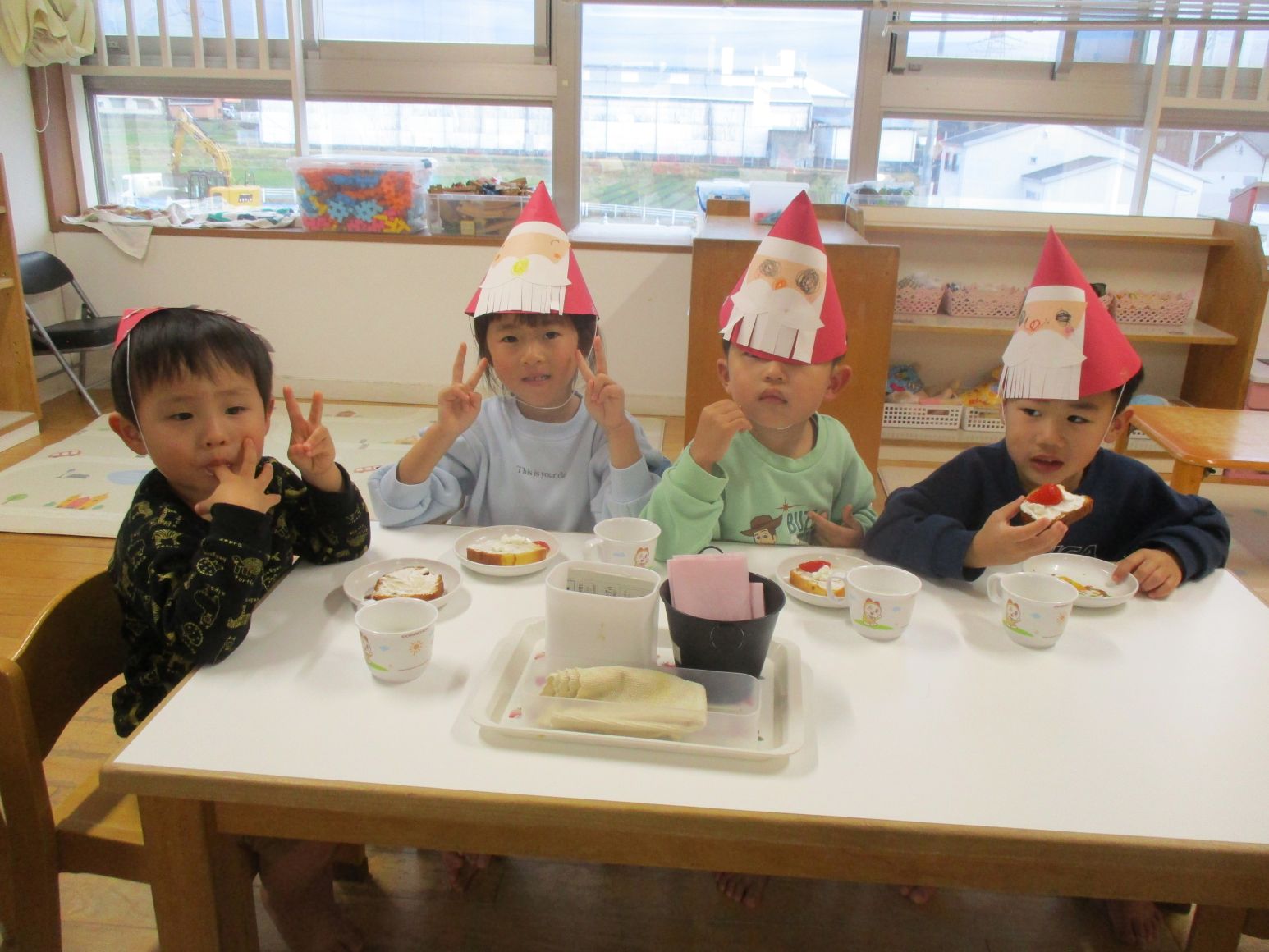 24日に12月のお誕生会がありました。未満児さんはれもんぐみさんで、以上児さんは2Fホールにて行いました。誕生会が終わるころ♬シャンシャンシャン~と鈴の音が。サンタさんに質問したり、記念撮影した楽しい時間を過ごしました。3時のおやつはいちごケーキ♡クリスマスパーティーをしているクラスもありました♪