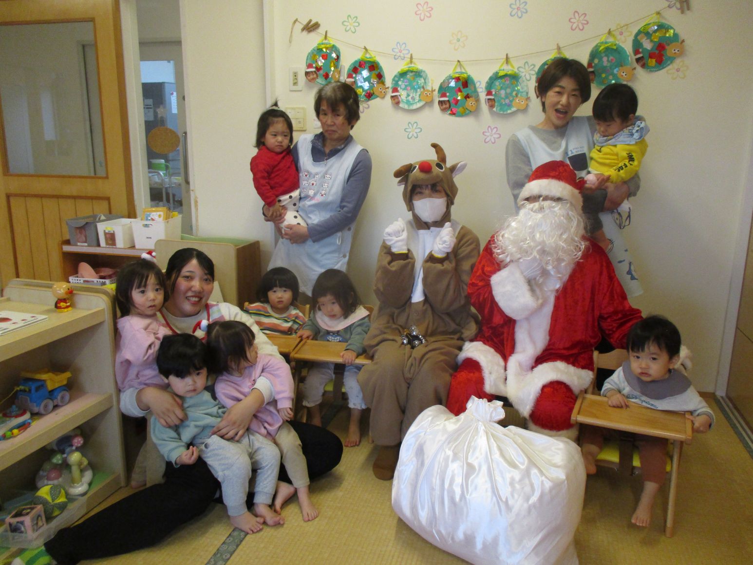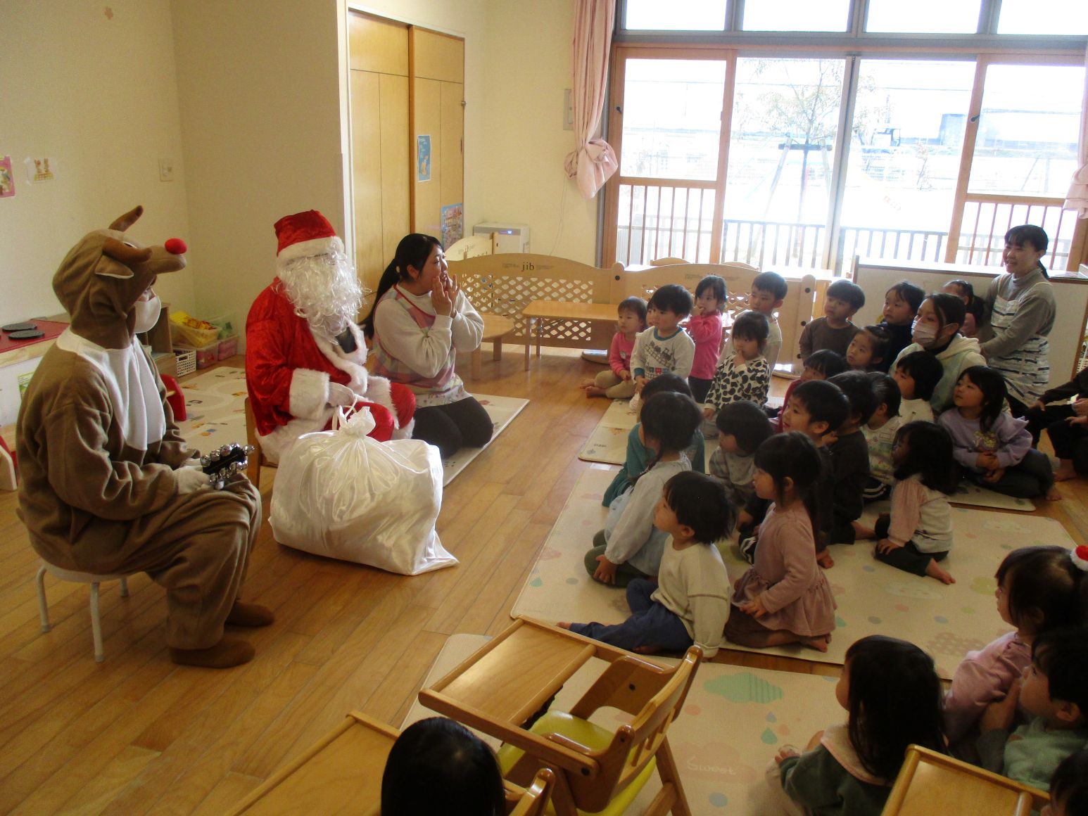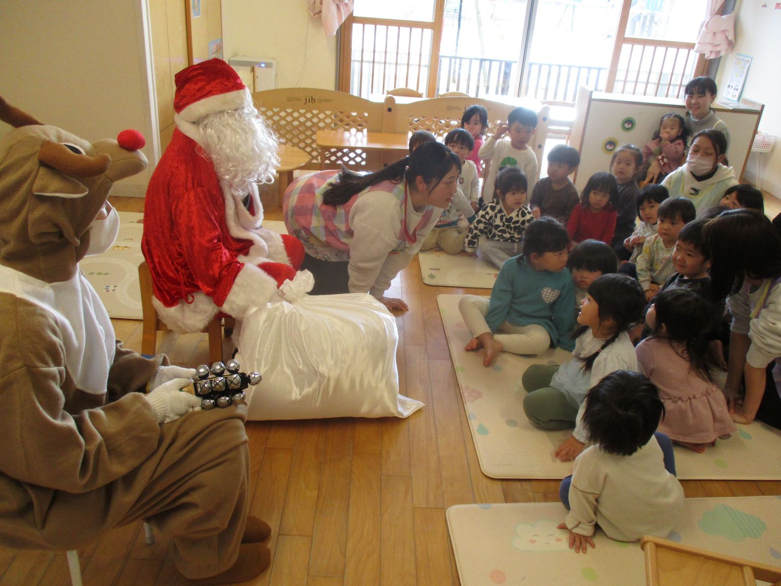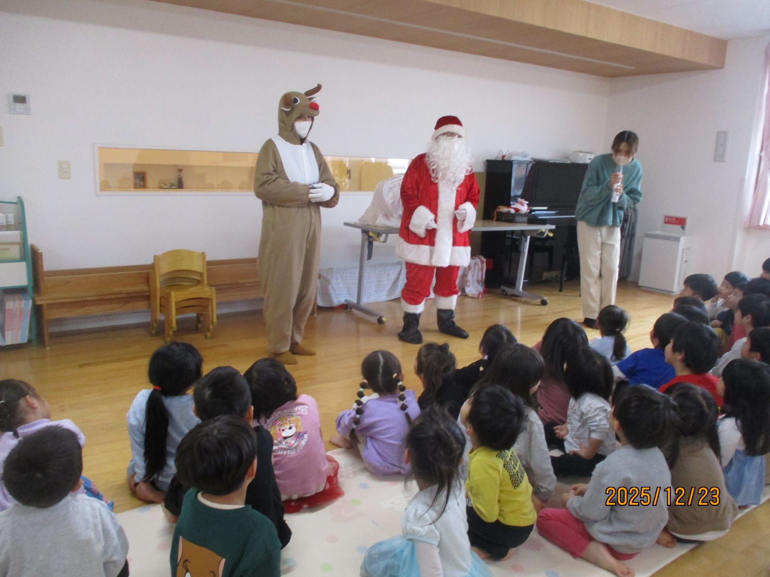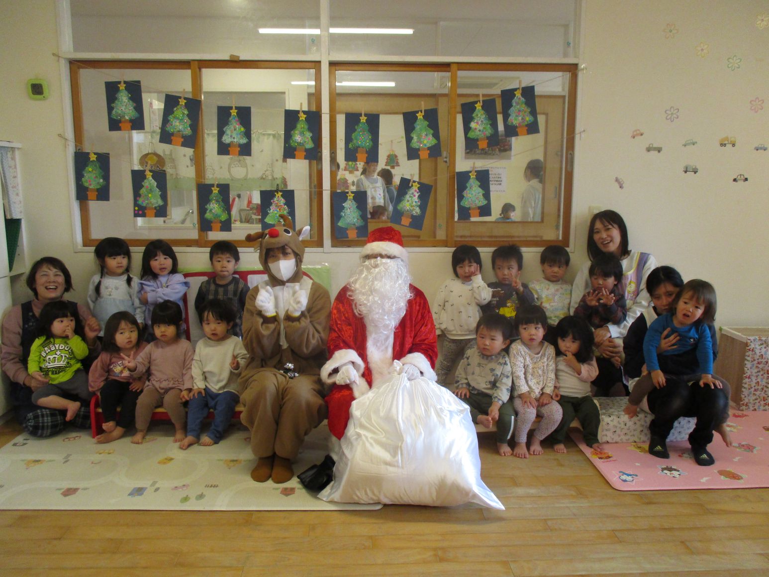 24日に12月のお誕生会がありました。未満児さんはれもんぐみさんで、以上児さんは2Fホールにて行いました。誕生会が終わるころ♬シャンシャンシャン~と鈴の音が。サンタさんに質問したり、記念撮影した楽しい時間を過ごしました。3時のおやつはいちごケーキ♡クリスマスパーティーをしているクラスもありました♪