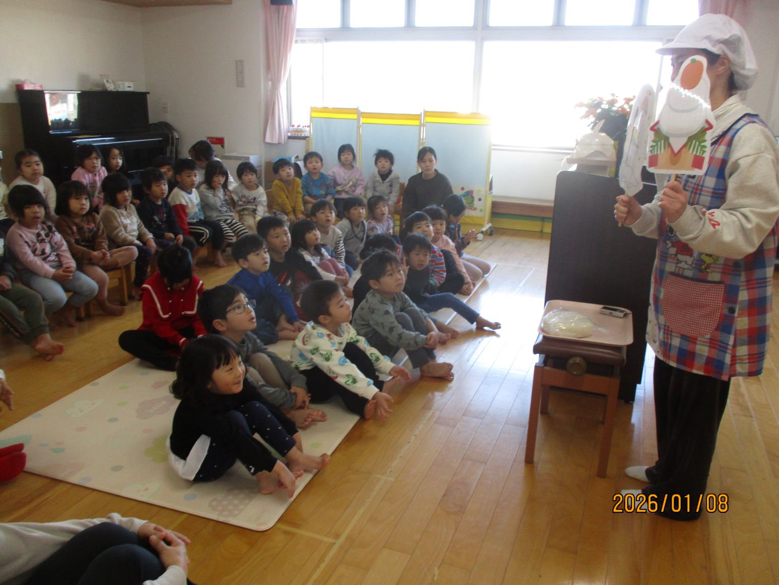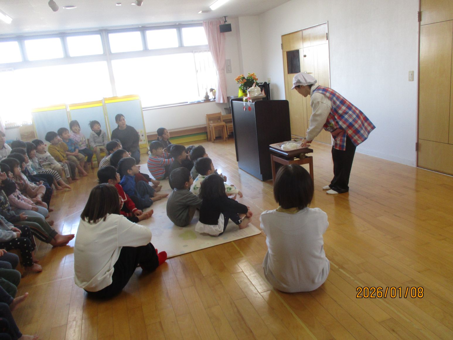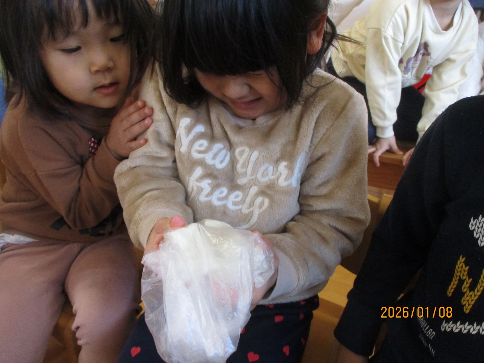 1月8日に以上児はホールにて鏡開きを行いました。給食の先生から、神様にお供えしたお餅なので包丁は使わず、手で開くことを聞くと早速、子どもたちも挑戦!