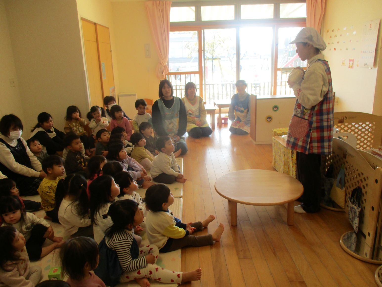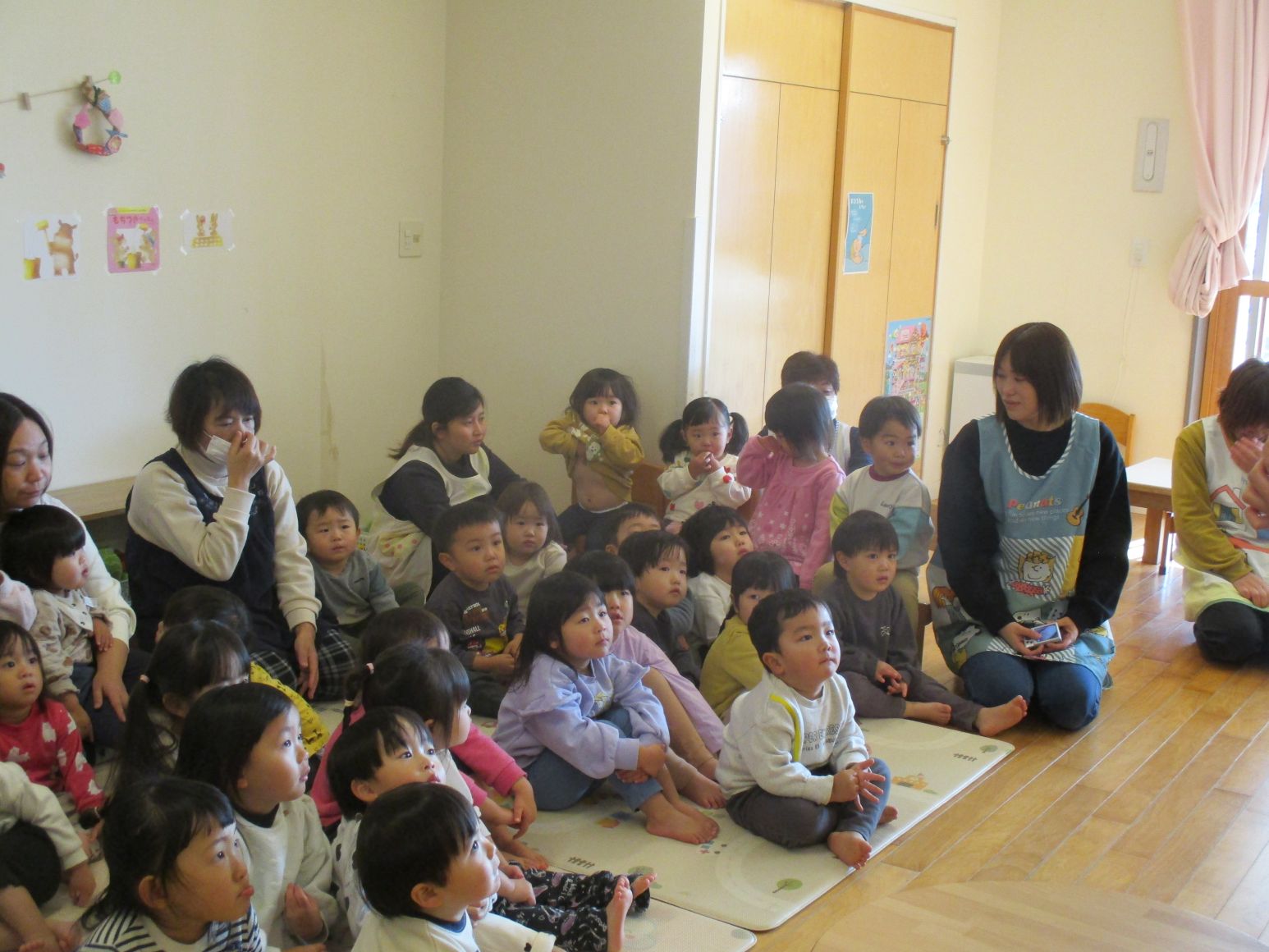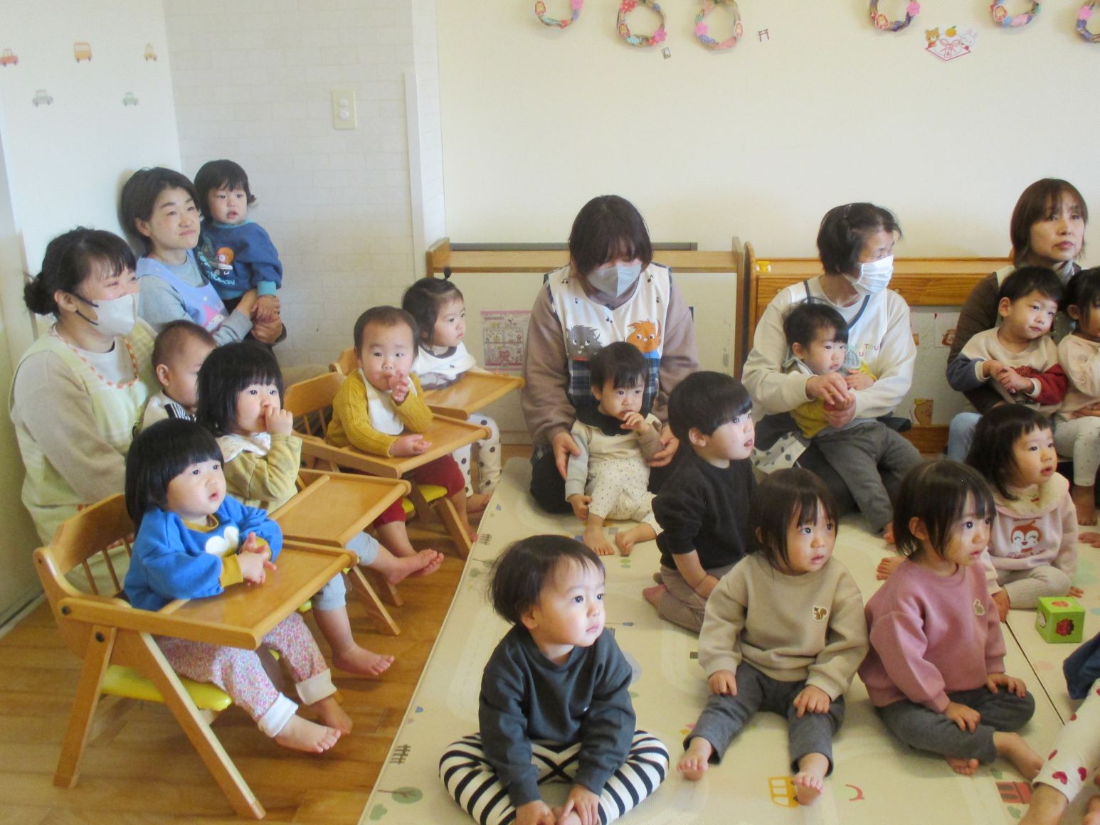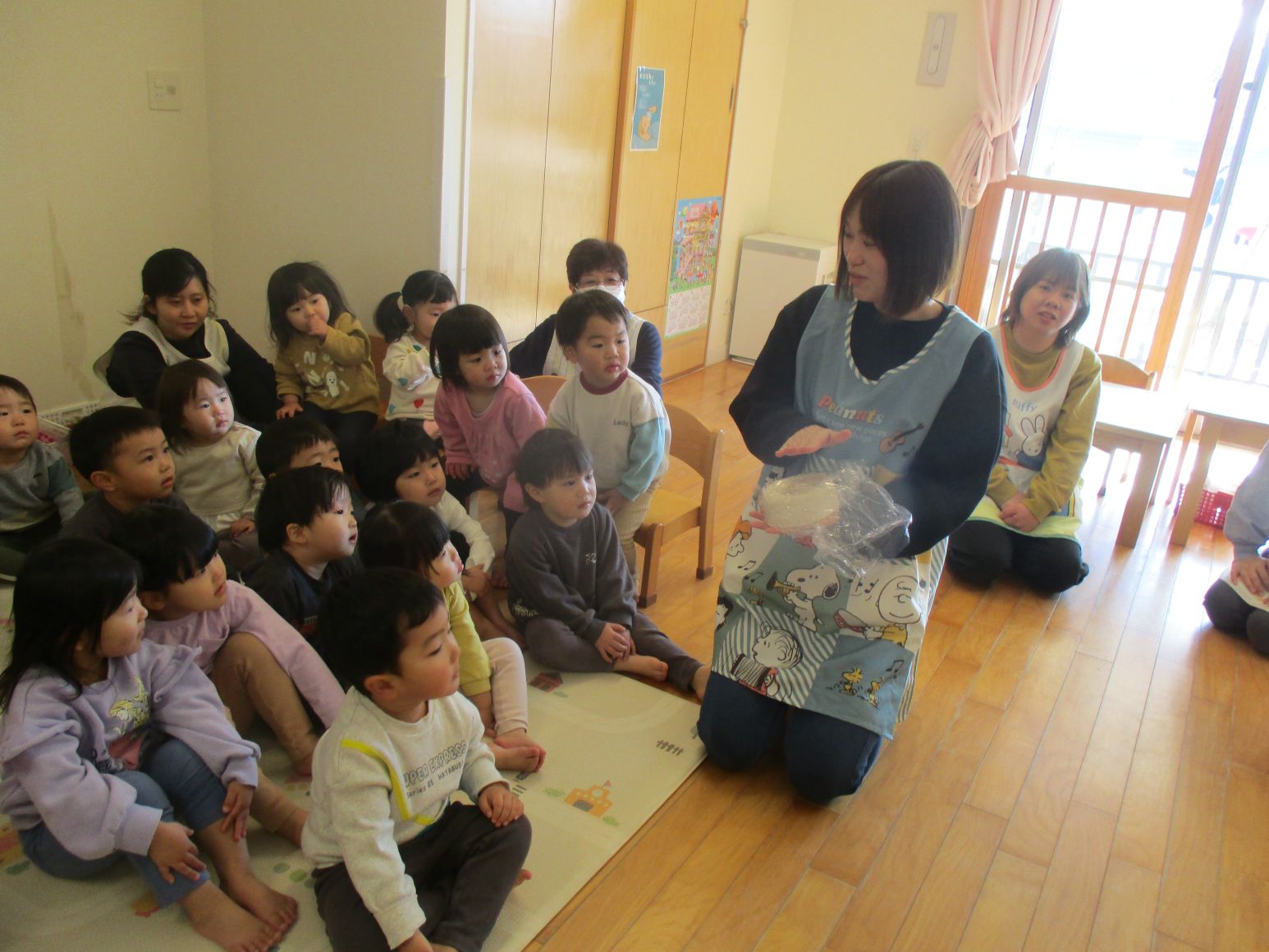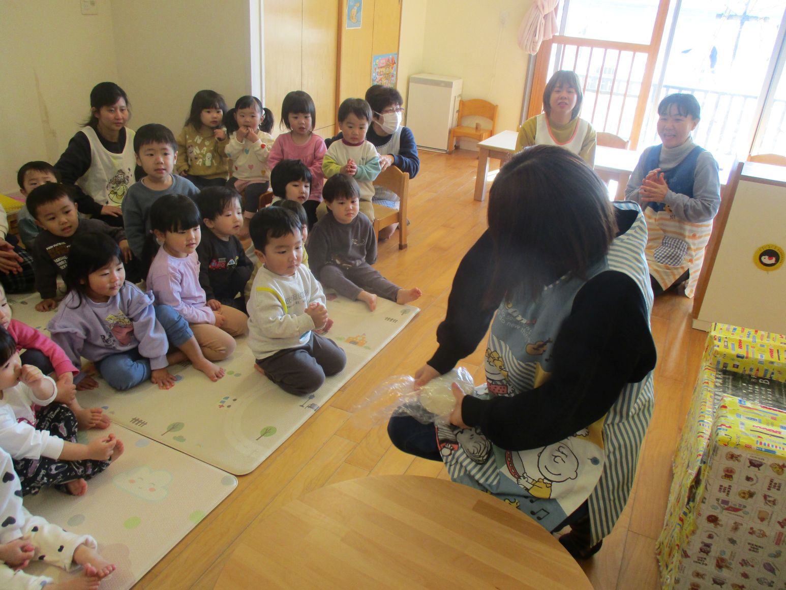 1月9日に鏡開きを行いました。給食の先生からお話を聞き、力持ちの先生がお餅を開くことになりました。とっても硬くて先生も力いっぱい頑張っています。がんばれ~!!