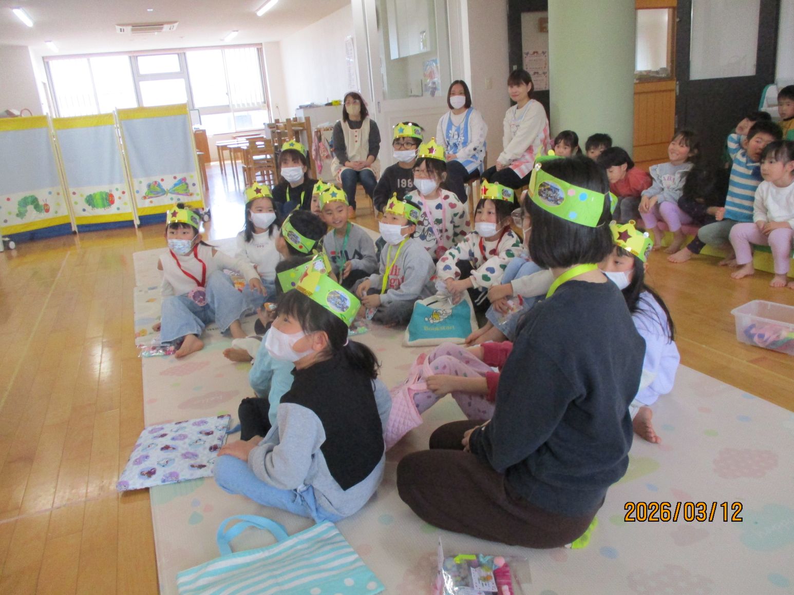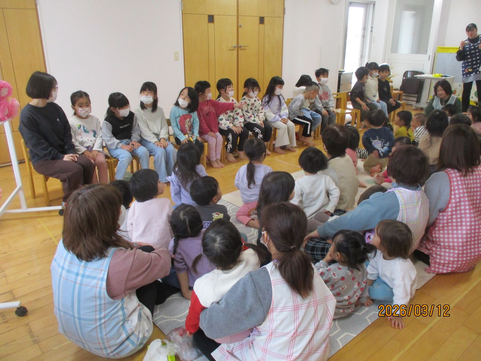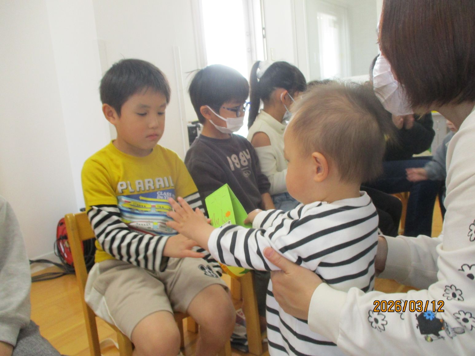 つばめぐみさんとのお別れ会を行いました。ホールに集まり各クラスから心のこもったプレゼント渡しや、先生からはひとりひとりへメッセージのプレゼント。給食の先生は大好きなリクエストメニューを作ってもらいました。4歳児が準備をして司会をしてくれました。優しいつばめぐみさんと、お別れする日が近くなるのでさみしいです。