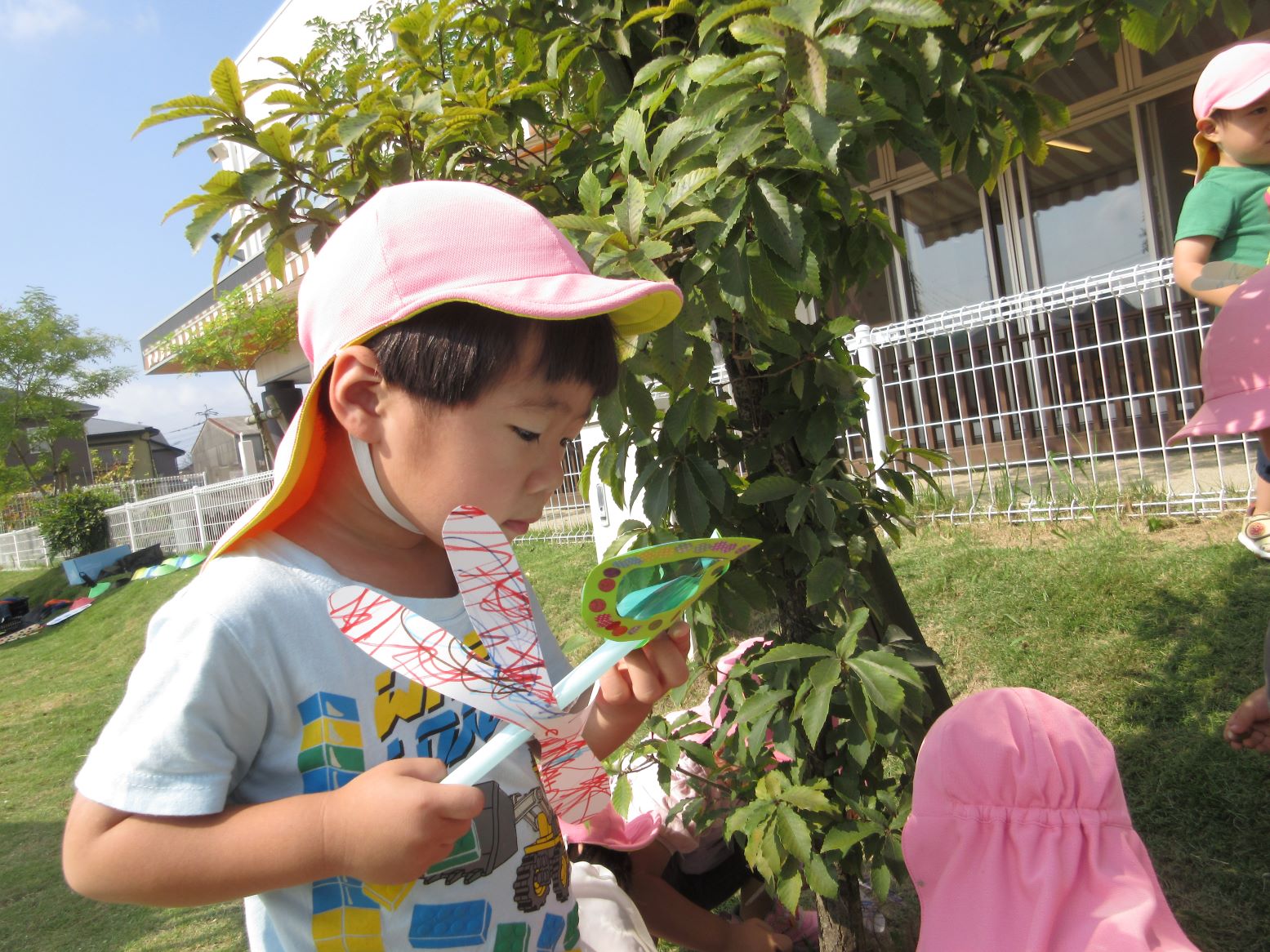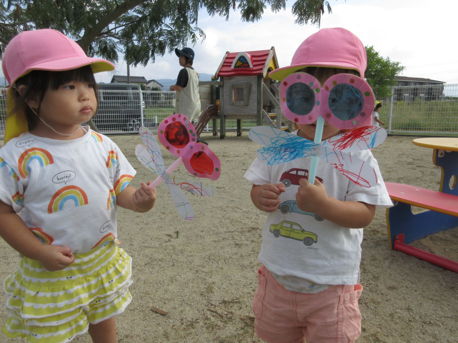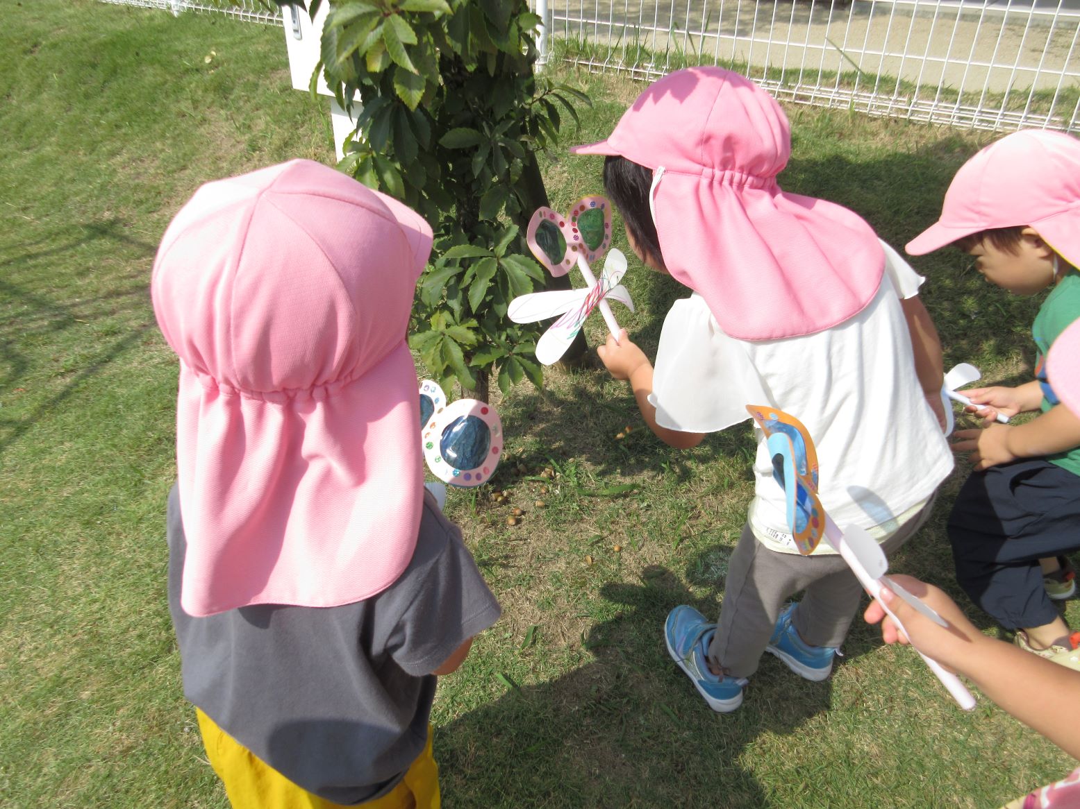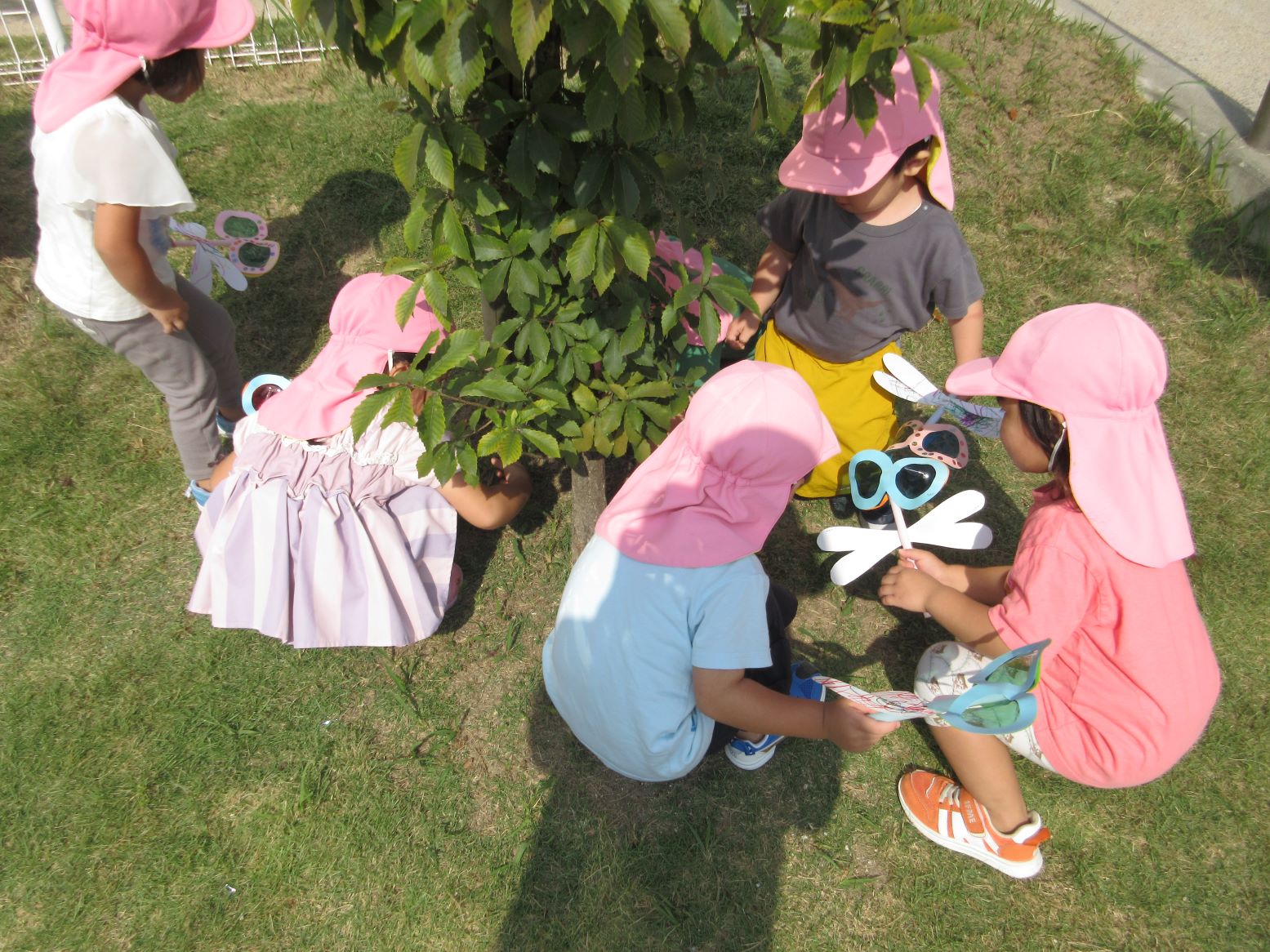 作ったトンボを持って外に遊びに行きました。何やら観察中☆