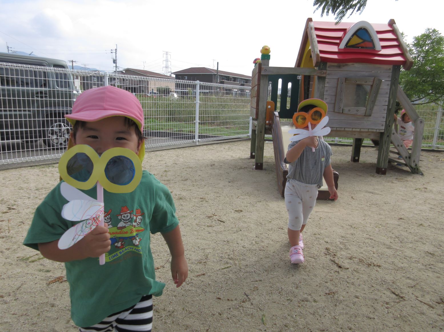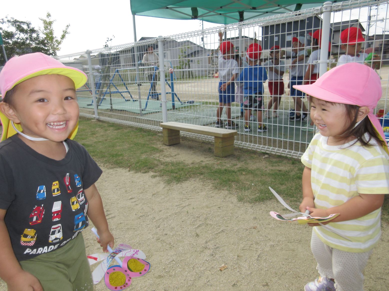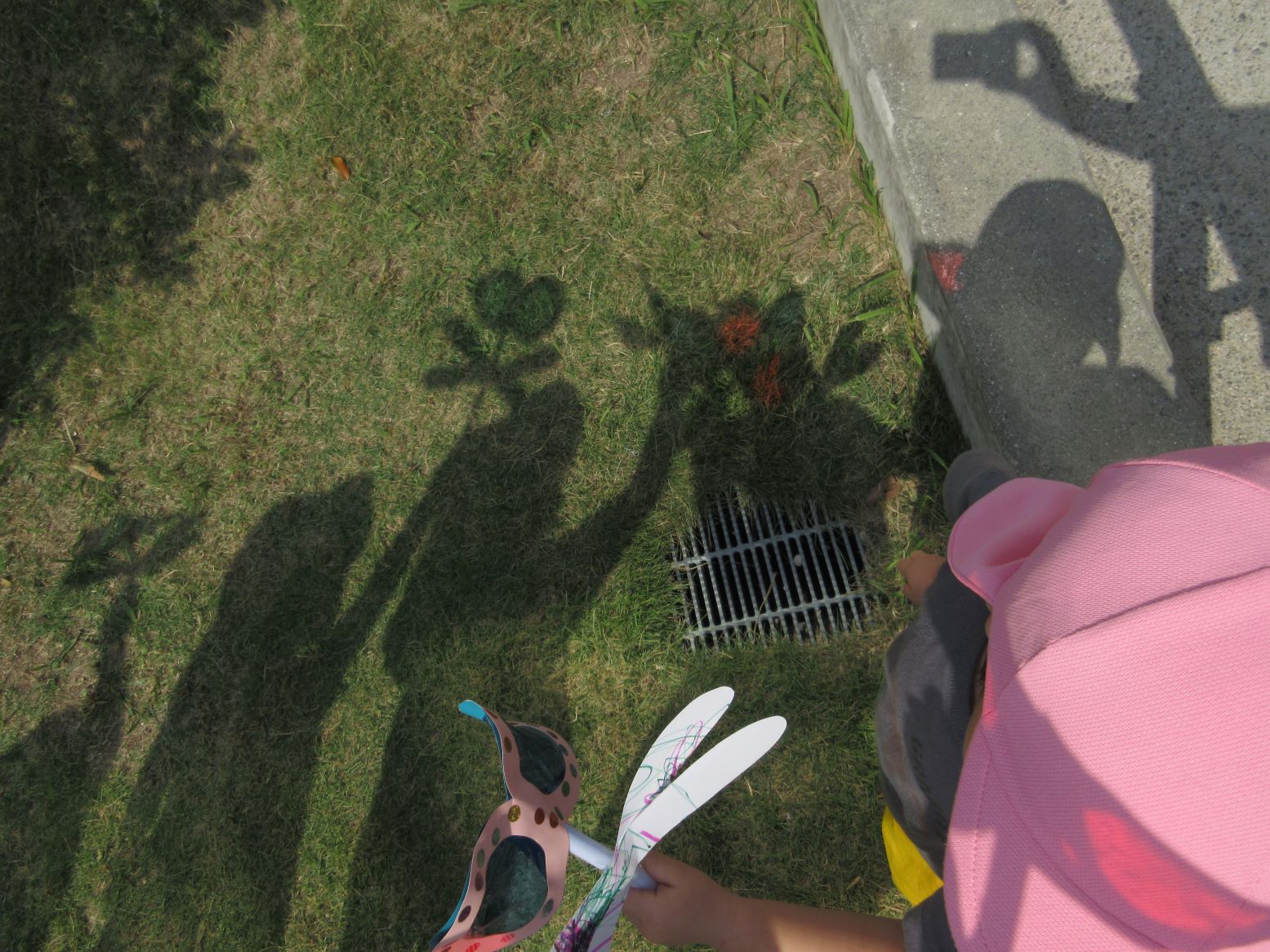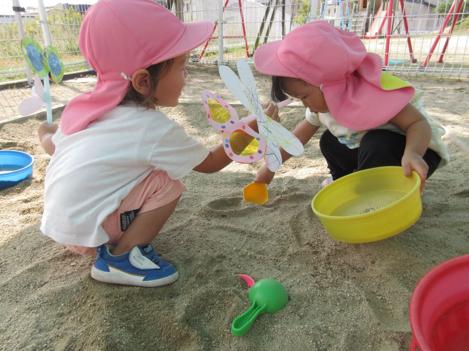 作ったトンボを持って外に遊びに行きました。何やら観察中☆