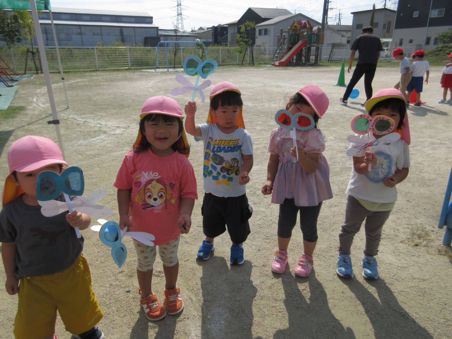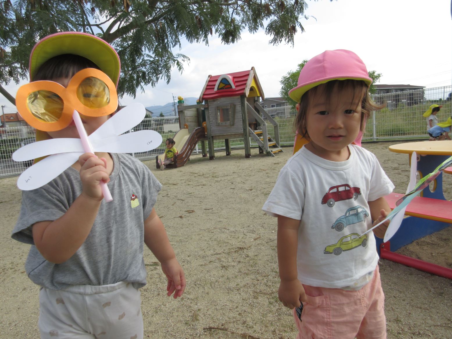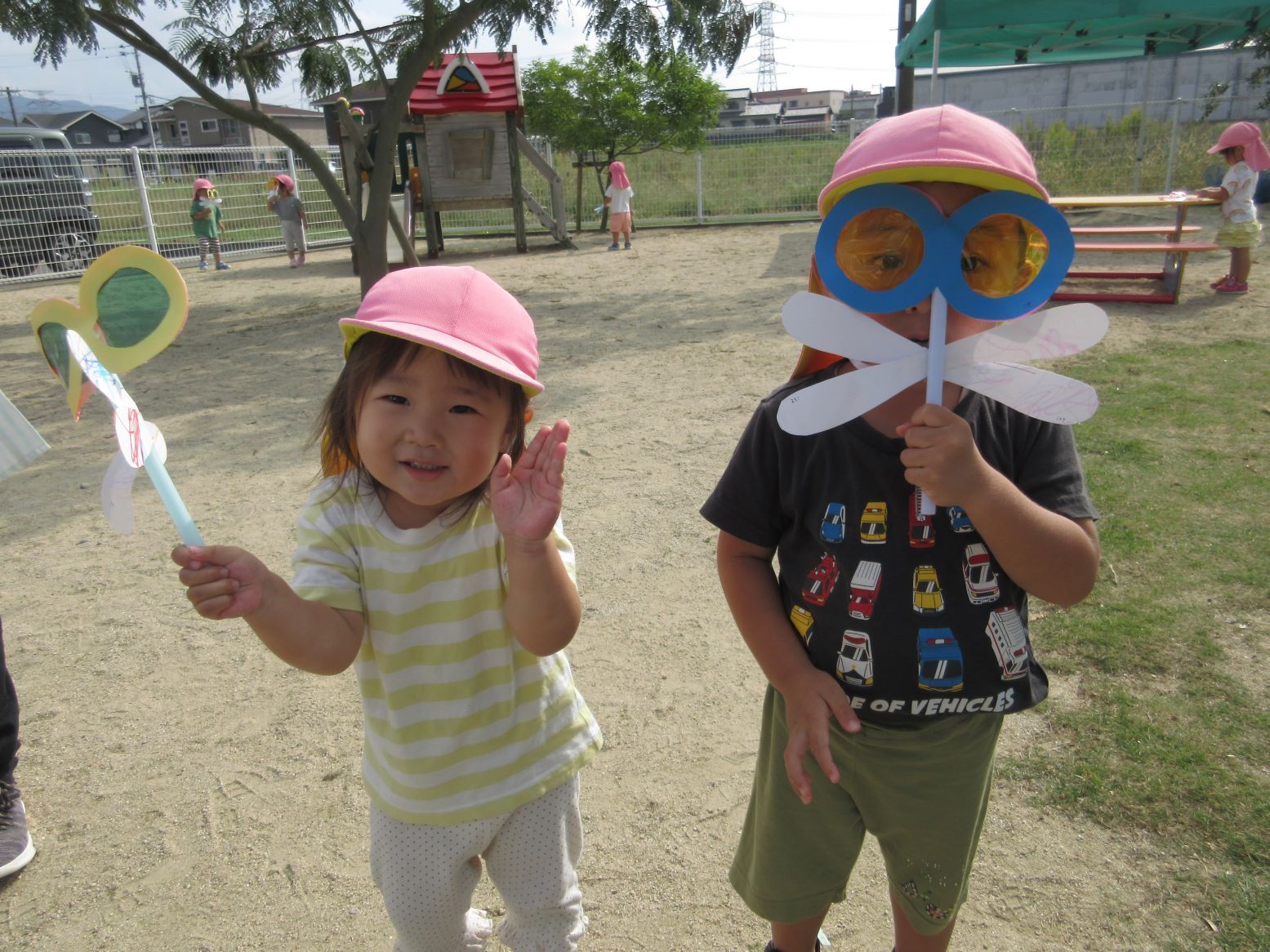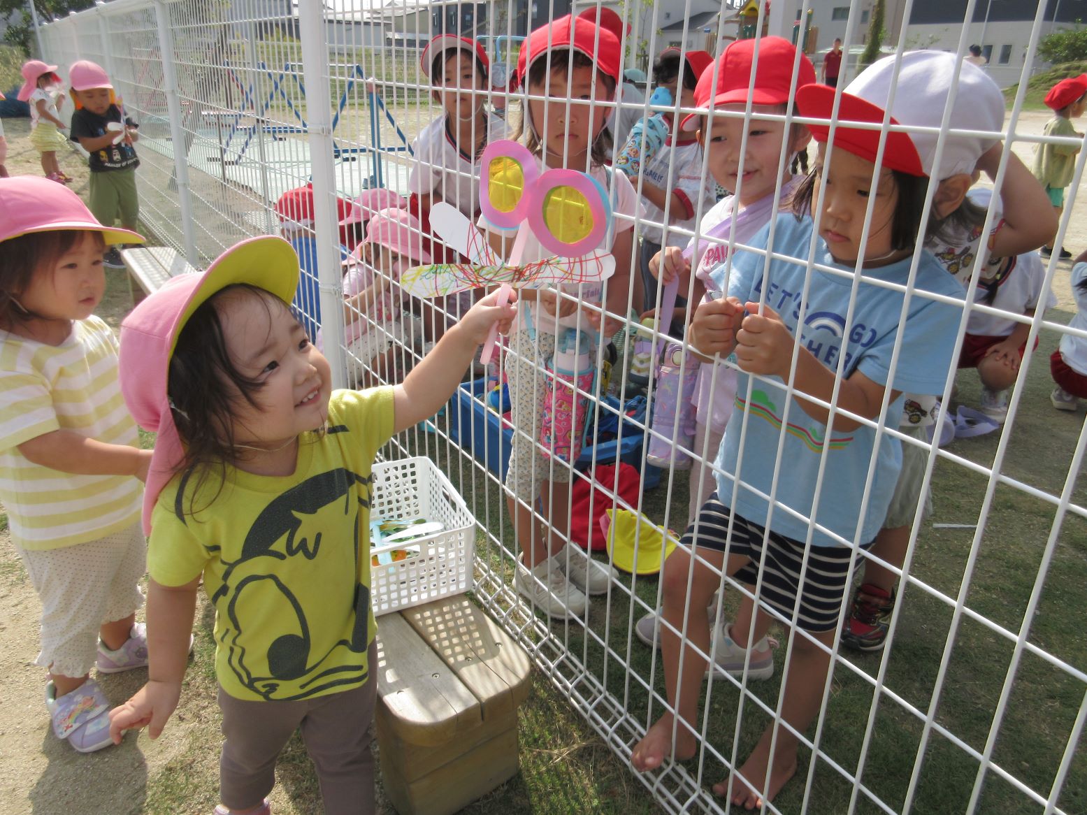 作ったトンボを持って外に遊びに行きました。何やら観察中☆