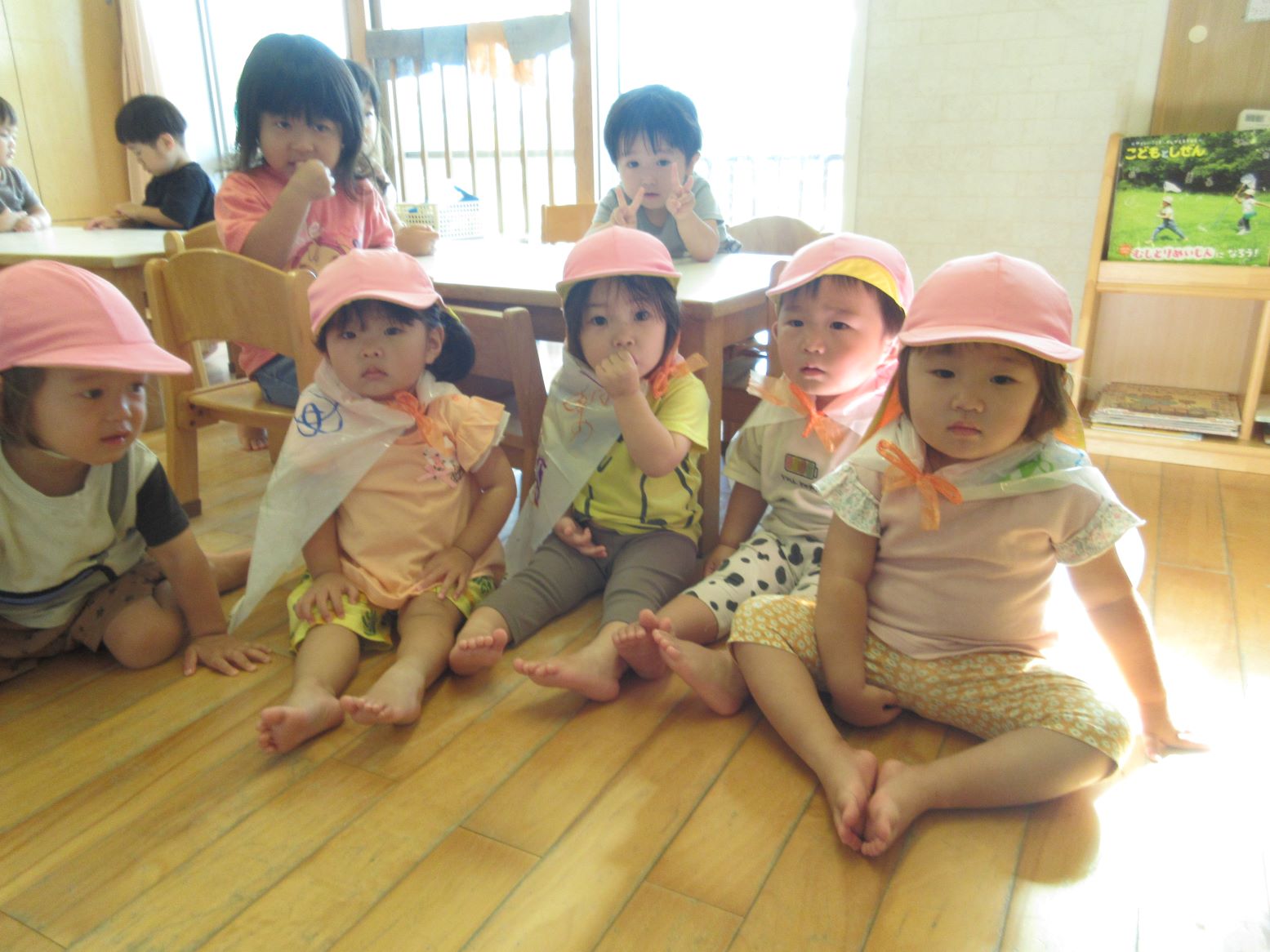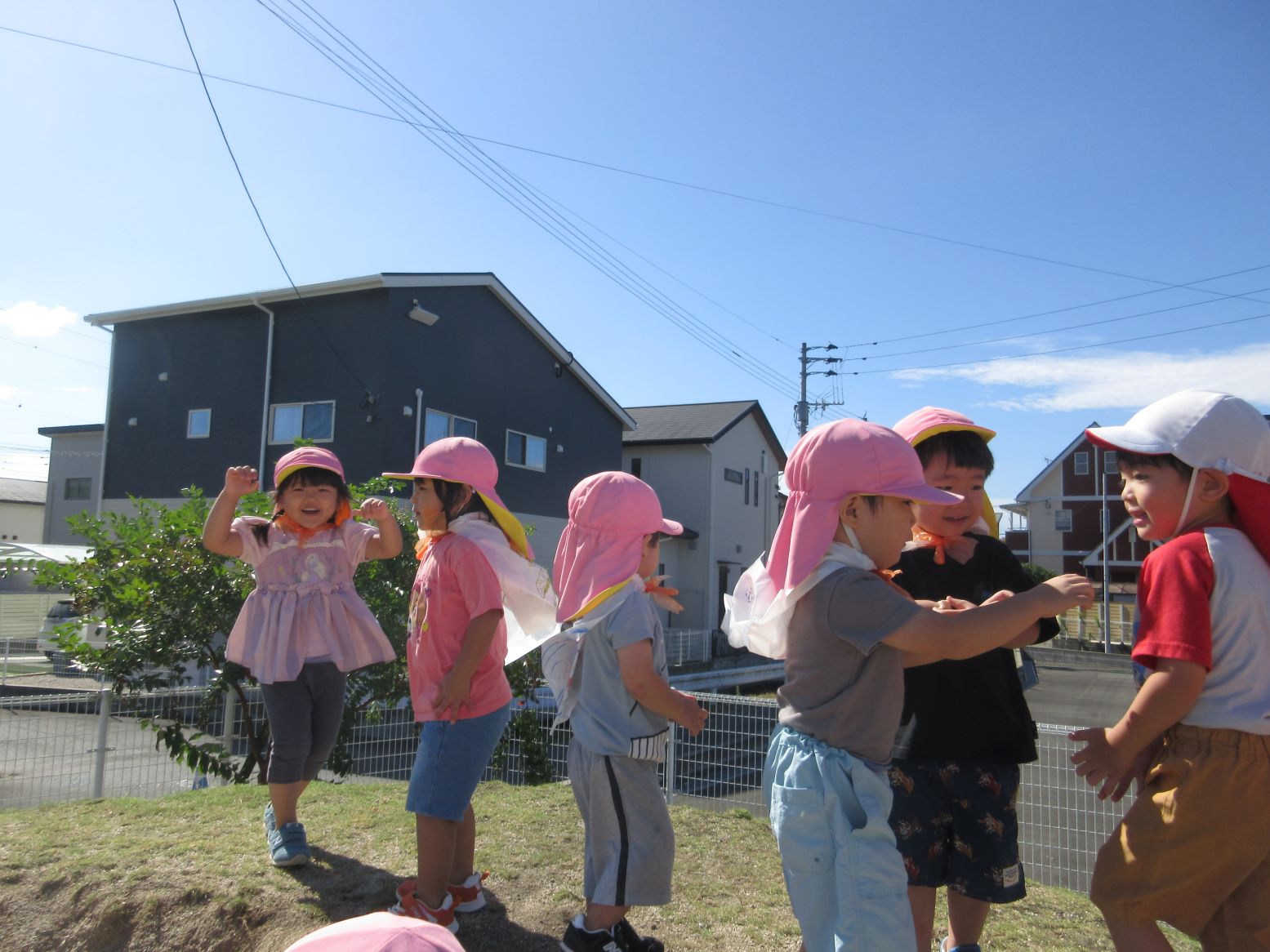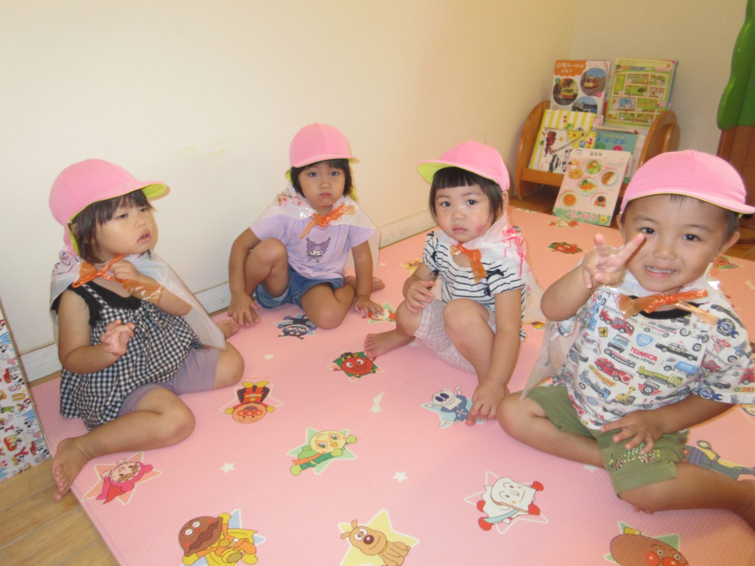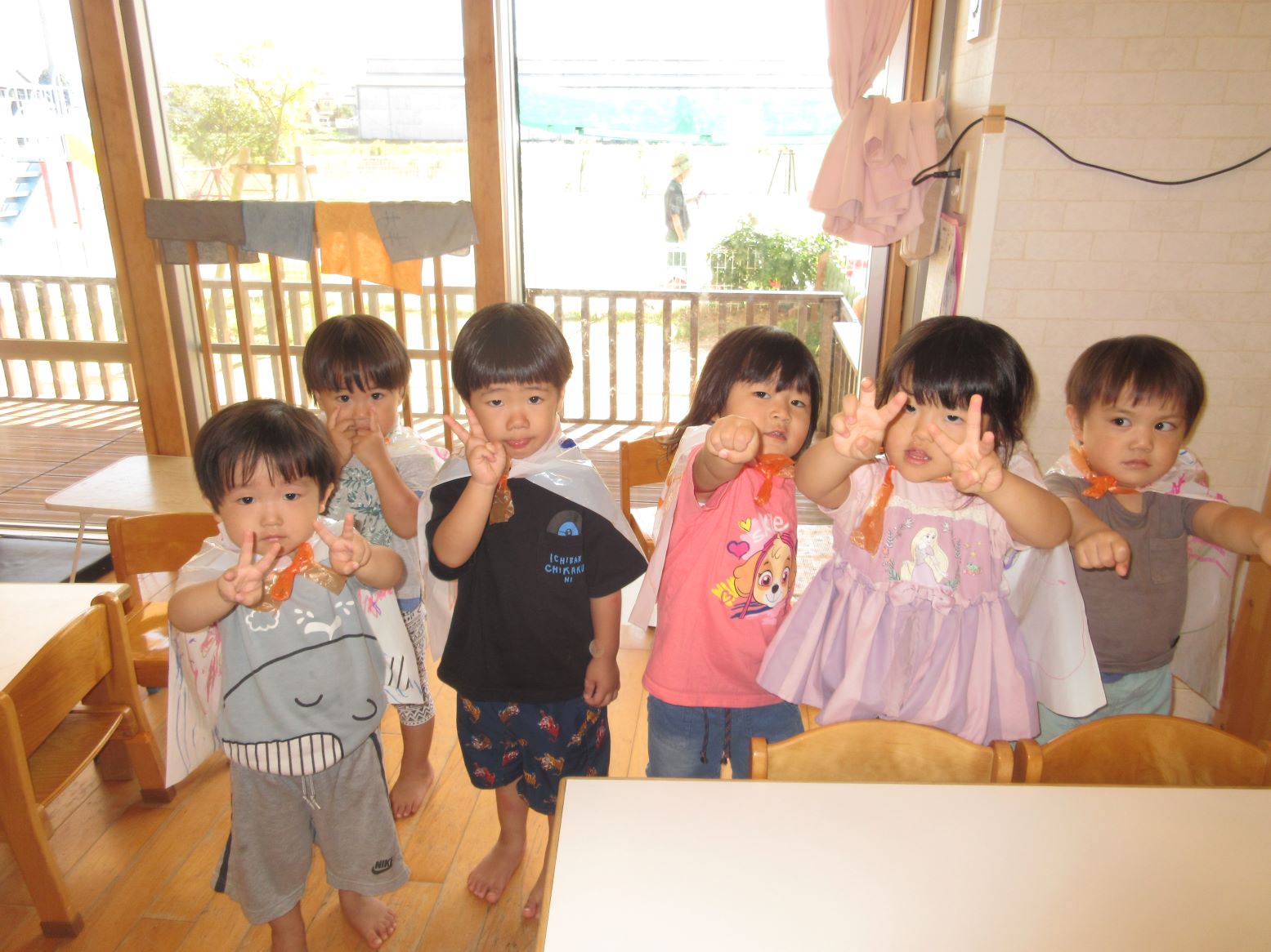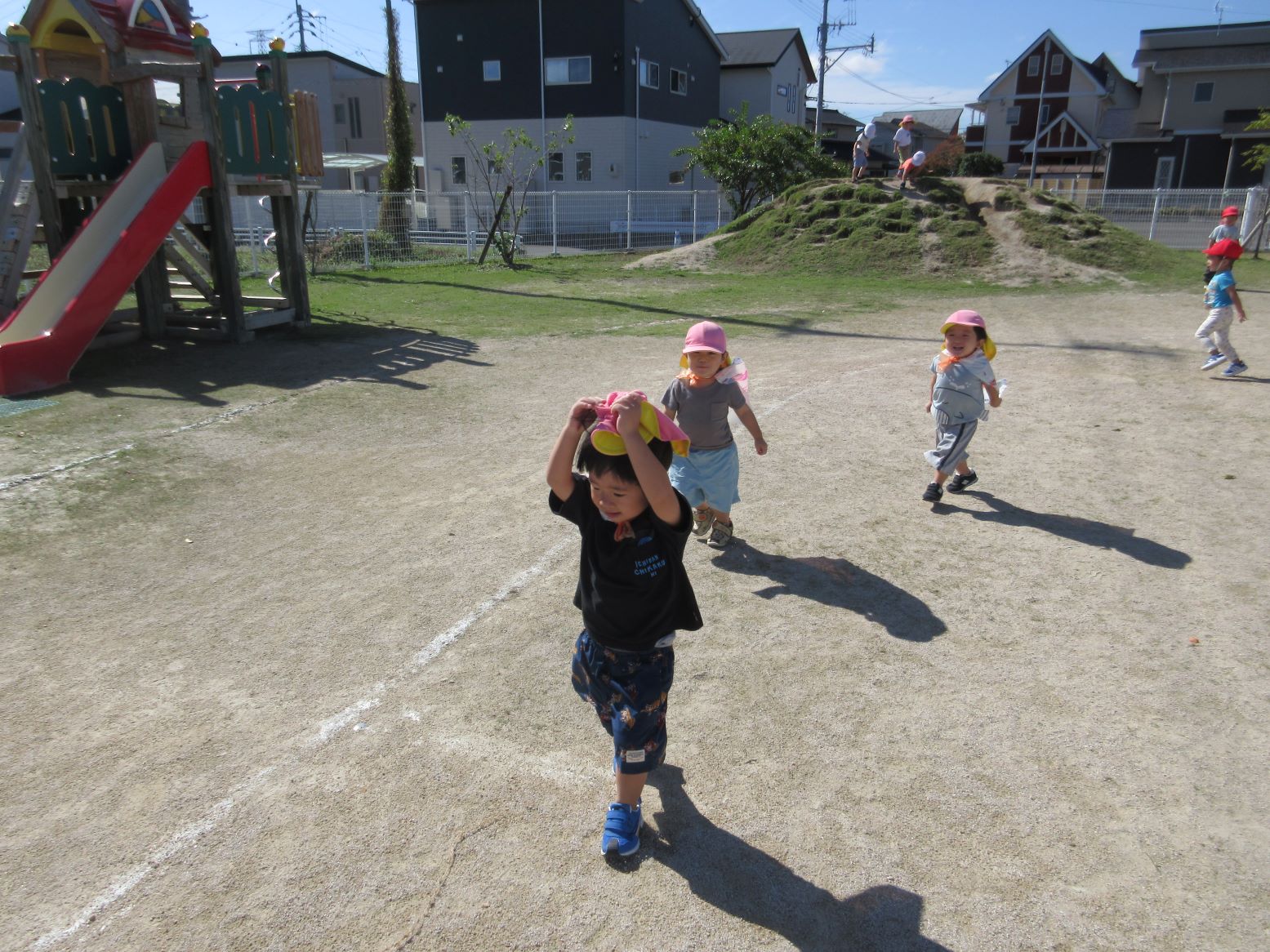 マントを作ったら早速つけて運動場に遊びに行きました。マントをつけてもらって大喜び。風になびくマントがかっこいいですね★