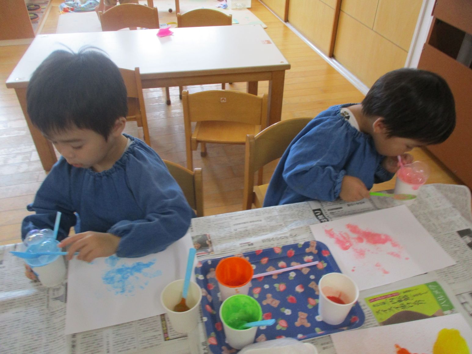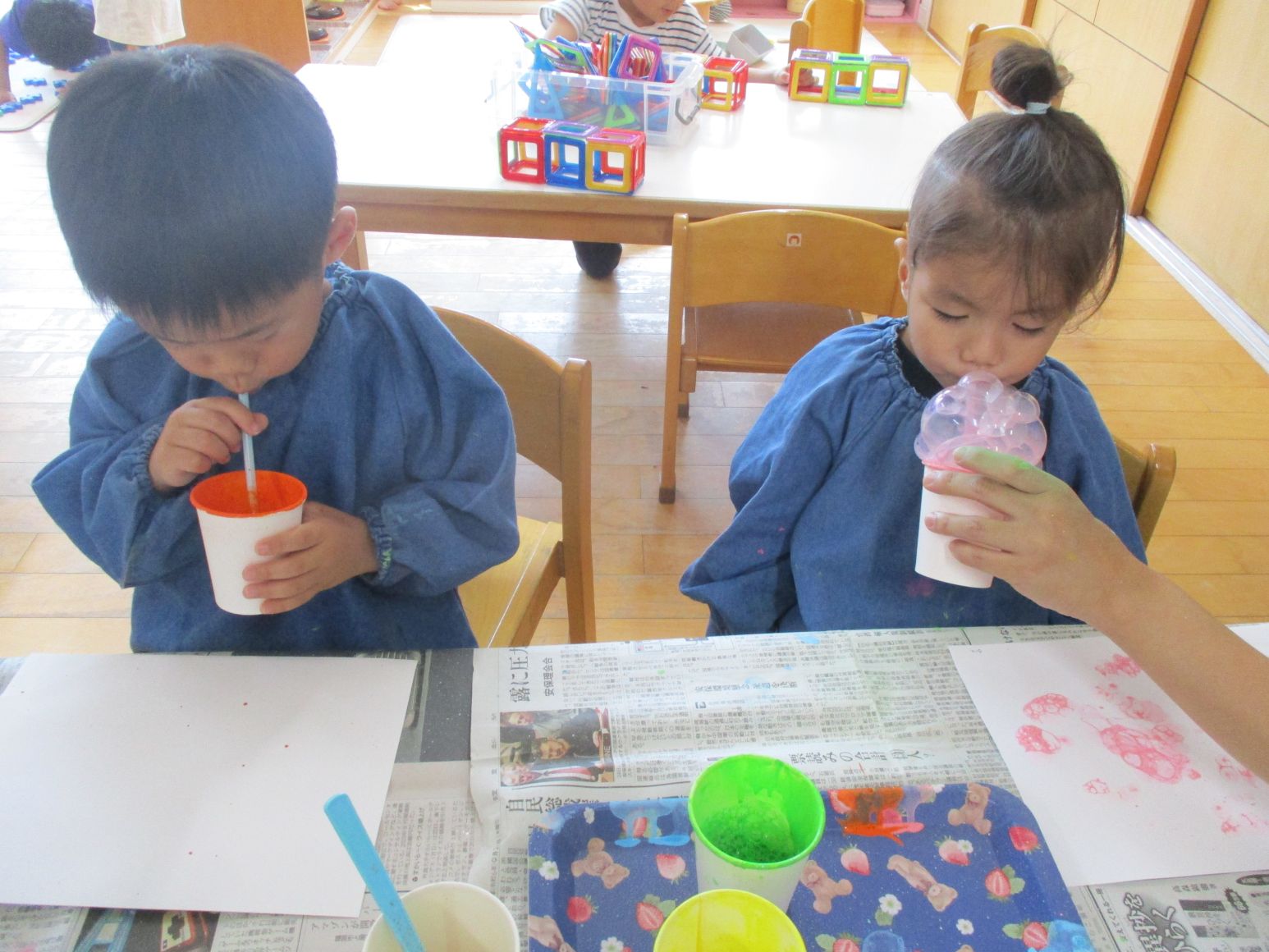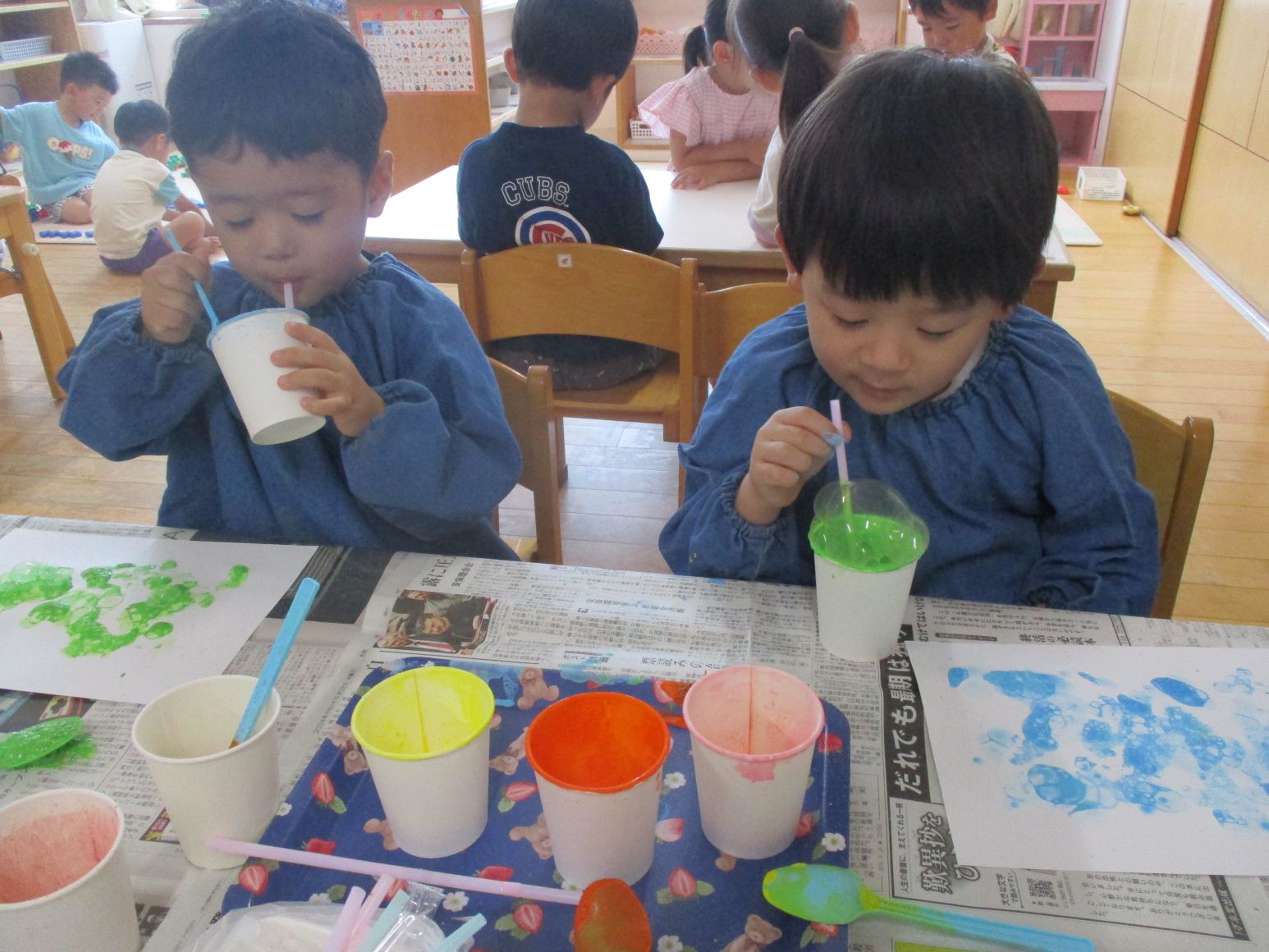 やってみたかったバブルアート☆好きなジュースの色を2色選んでブクブク~。泡をすくって紙の上へ置くとパチン!と泡が弾けて模様になりました。美味しそうなクリームソーダになりそうです☆