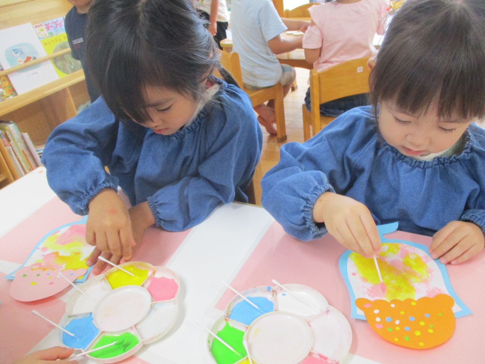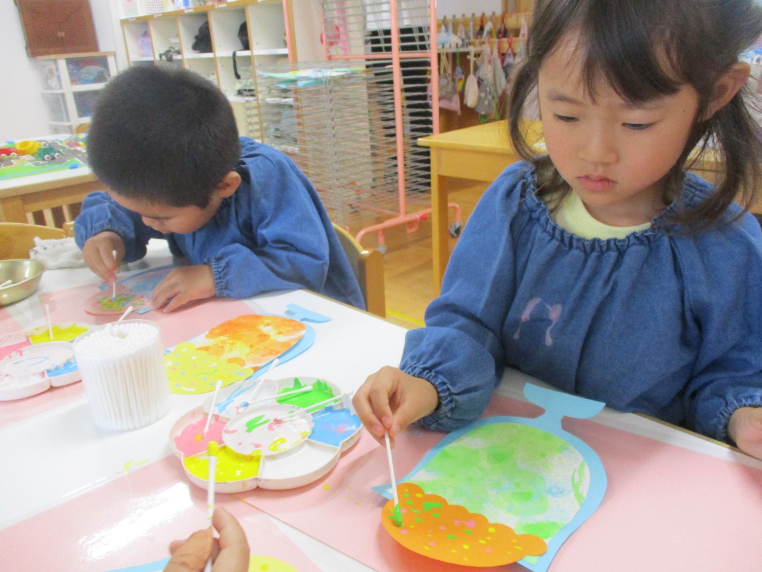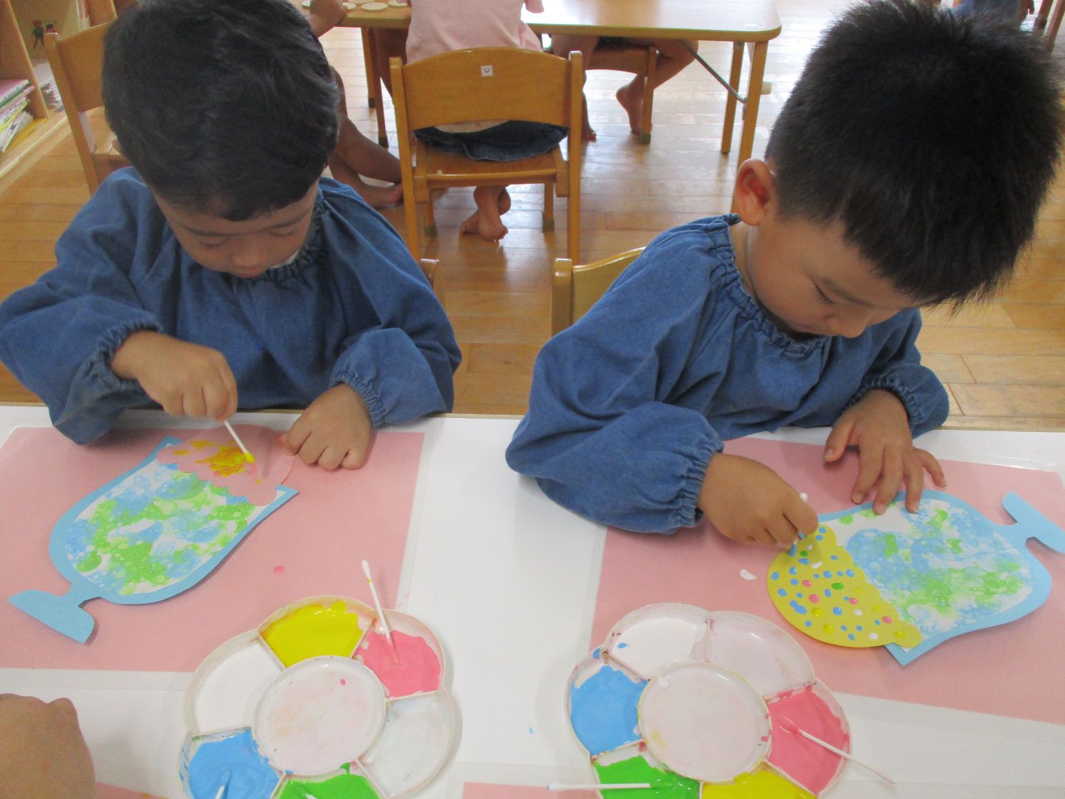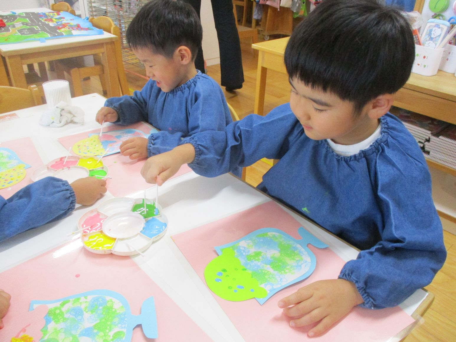 やってみたかったバブルアート☆好きなジュースの色を2色選んでブクブク~。泡をすくって紙の上へ置くとパチン!と泡が弾けて模様になりました。美味しそうなクリームソーダになりそうです☆