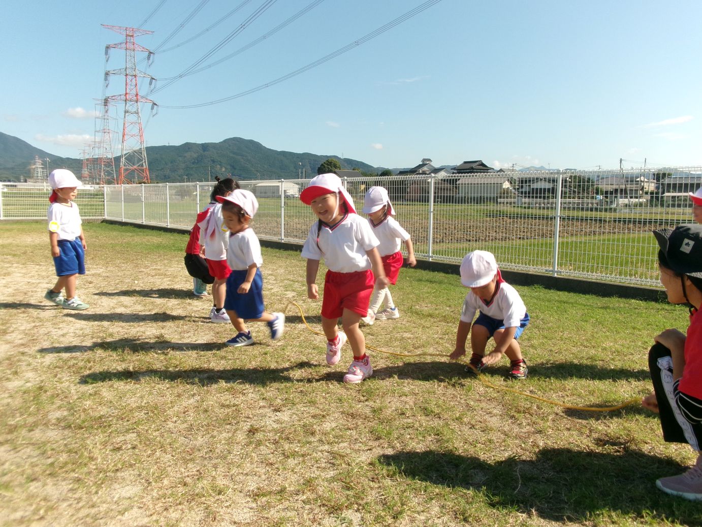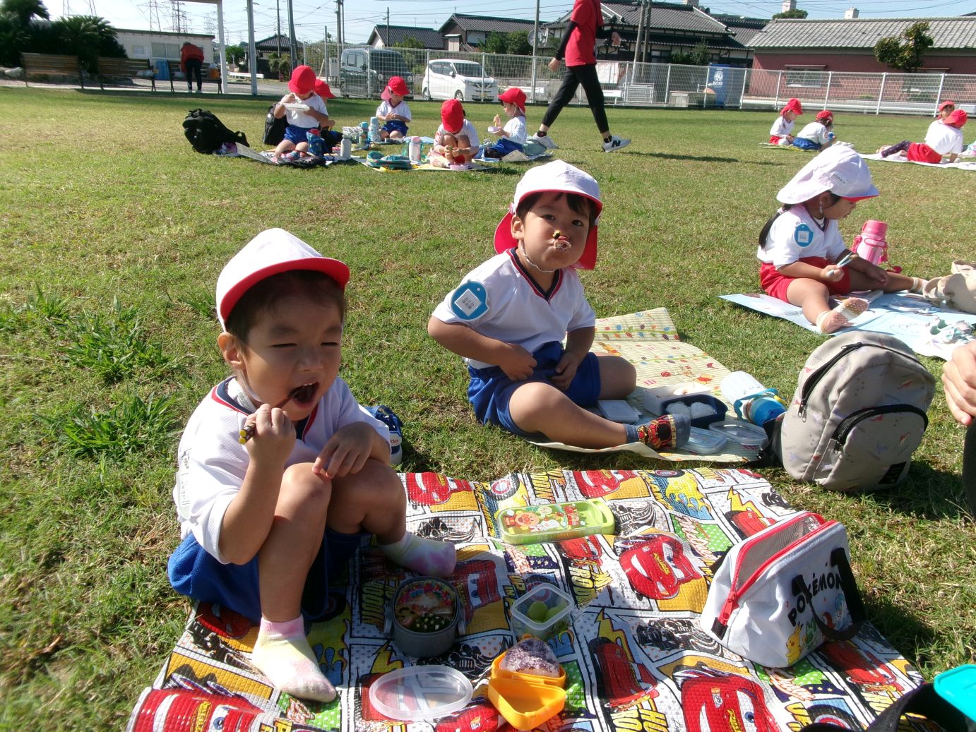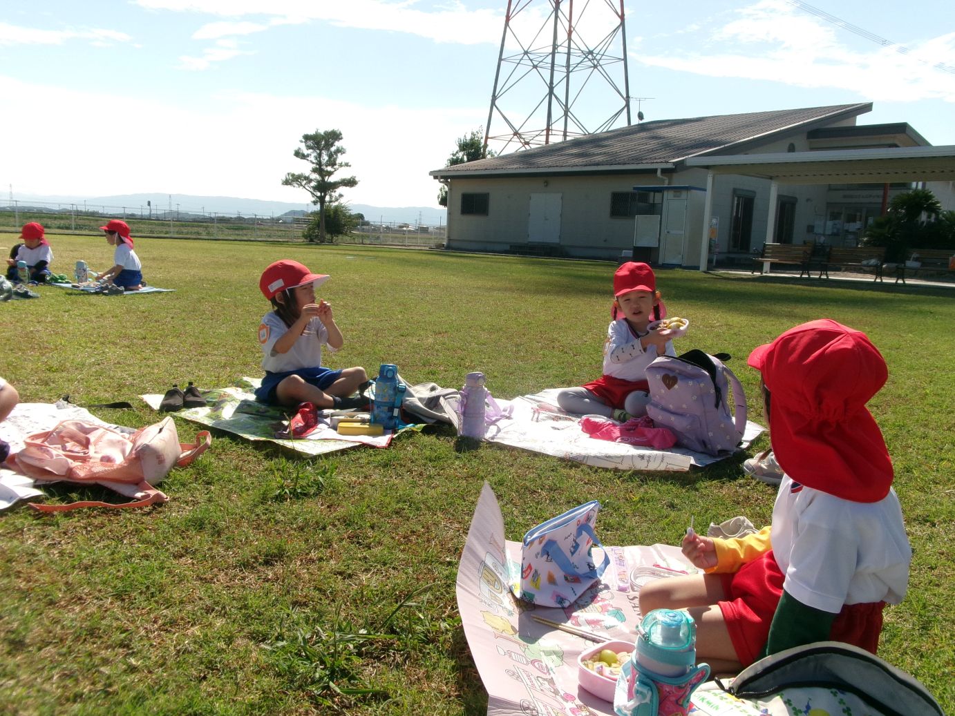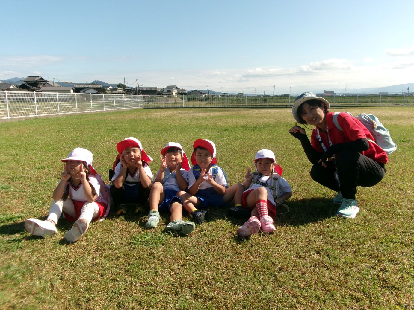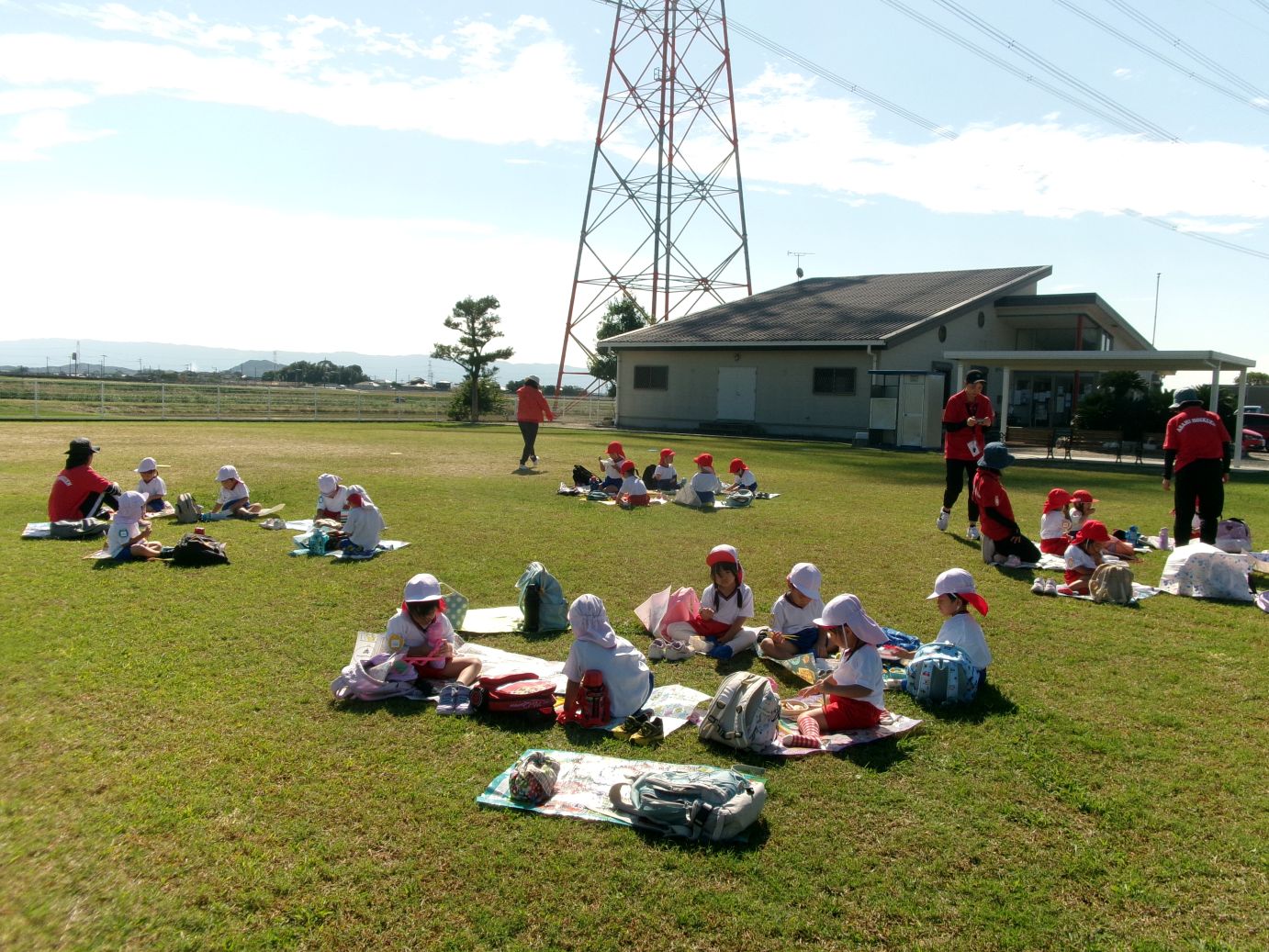 10月24日に3歳児があさひ公民館に遠足に行きました。あさひ公民館の芝生の広場はとても広くて気持ちの良い所でした。しっぽ取りや大繩で遊びました。お待ちかねのお弁当の時間はお弁当の蓋を開けると大喜びの表情♡「がんばるぞ~」「おお~!」と帰りも元気一杯の子ども達でした。