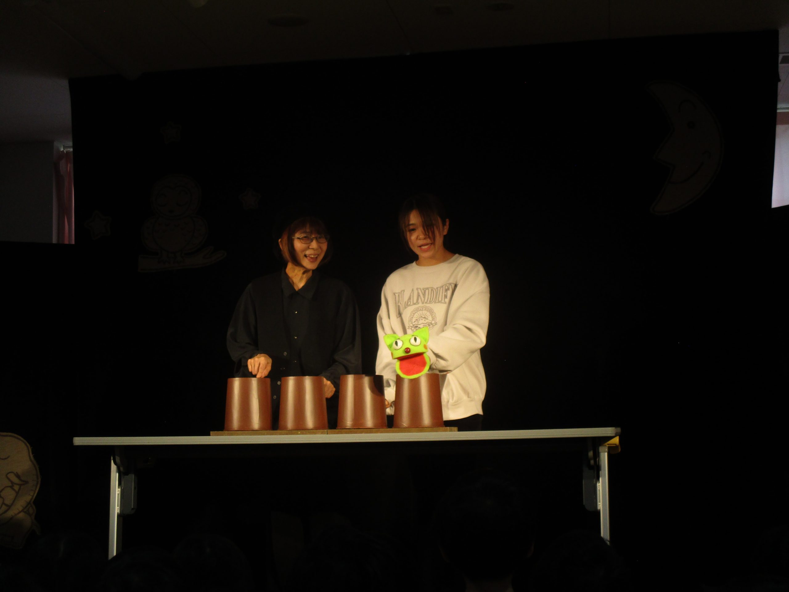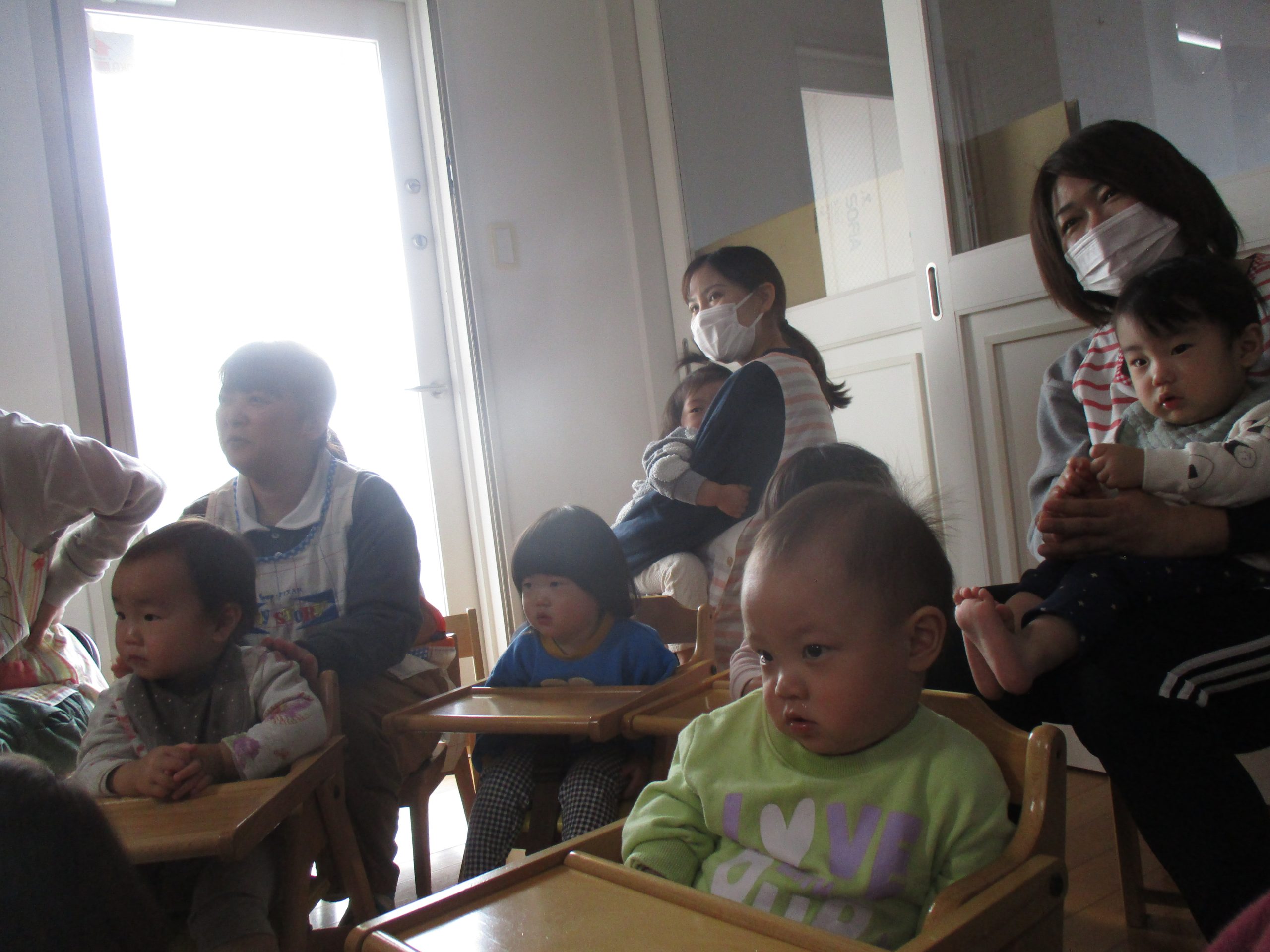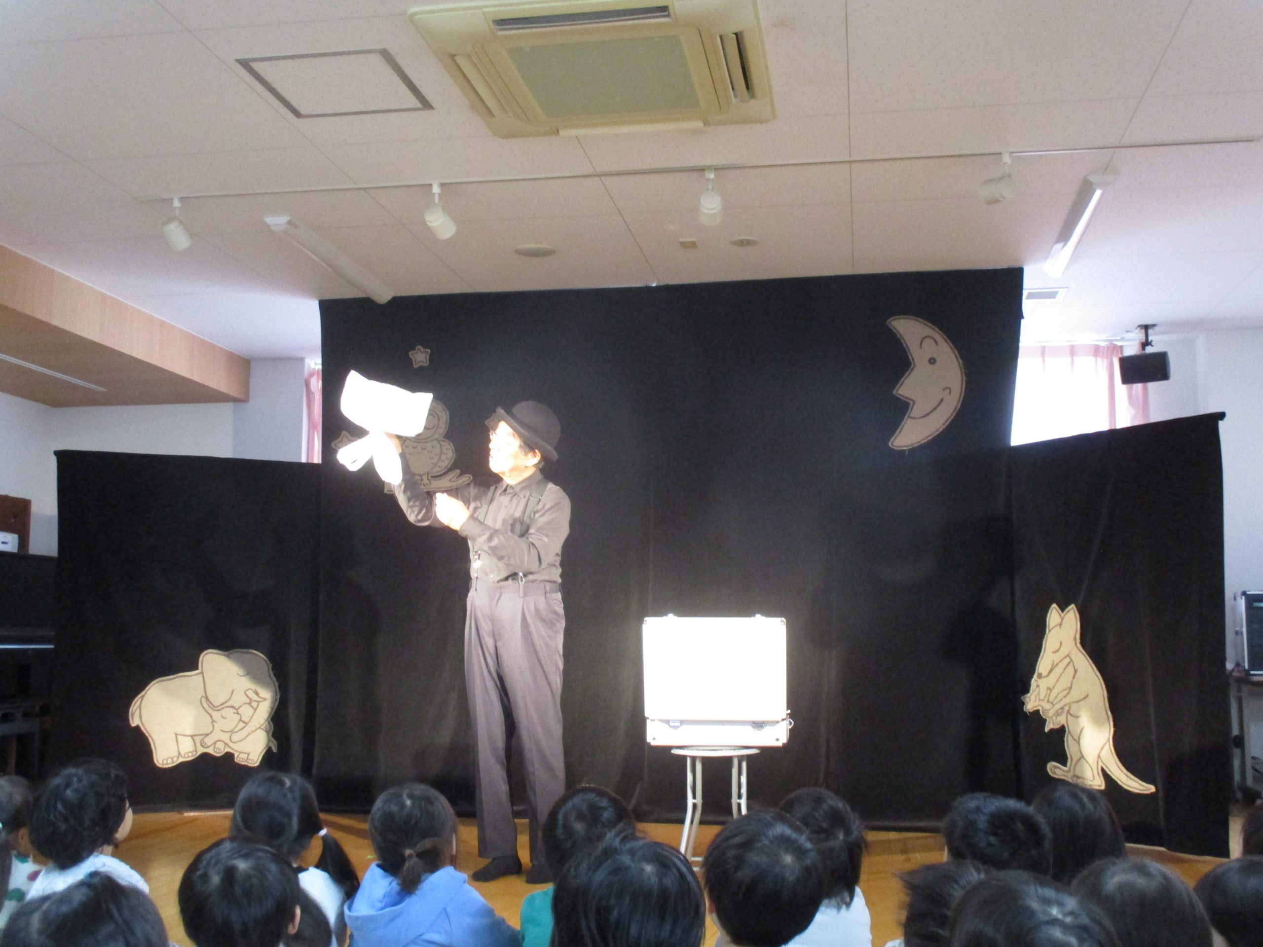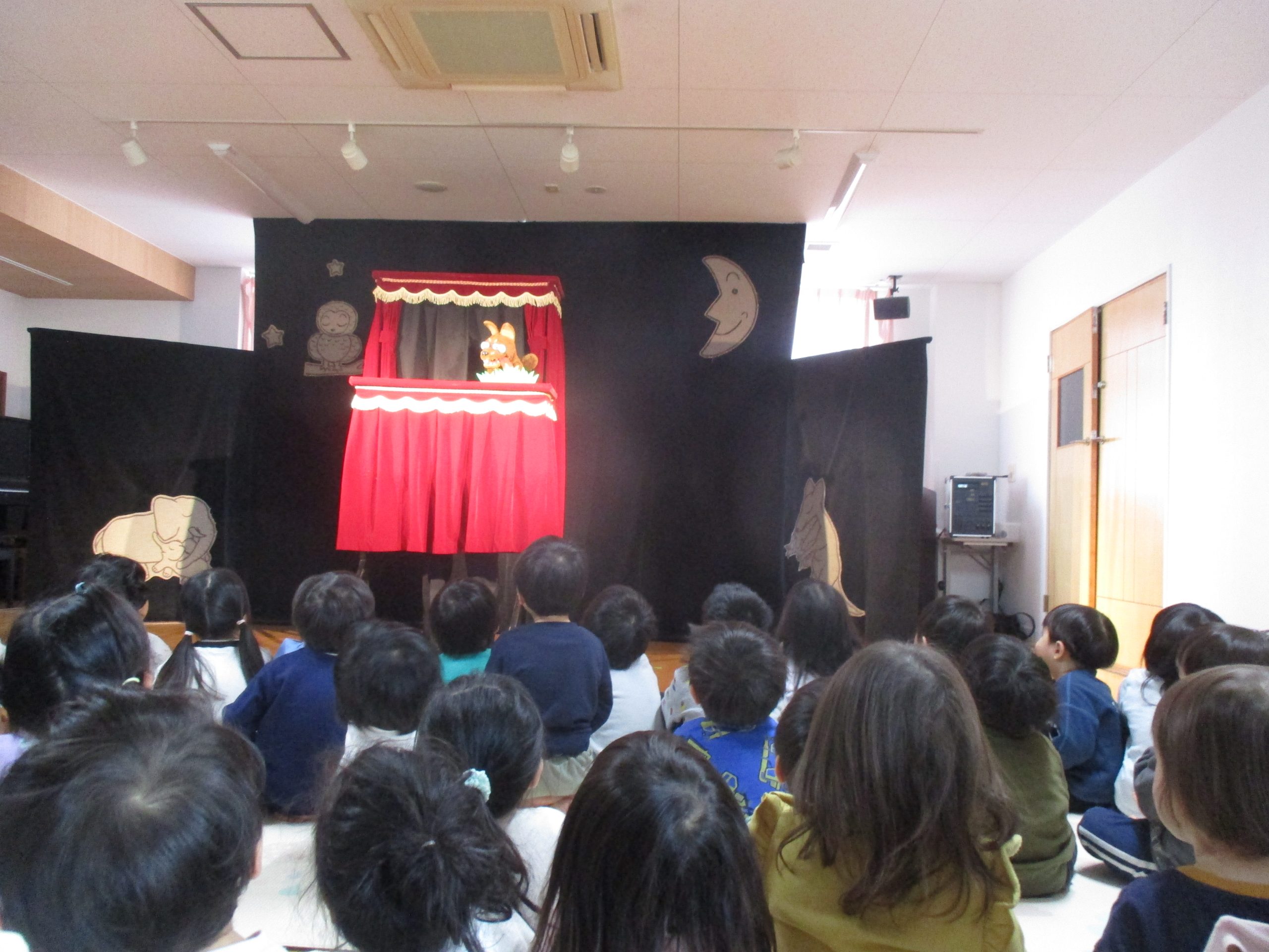北九州から『劇団ののはな』をお呼びして人形劇を観劇しました。0歳~年長さん全員ホールに集まりました。0才児さんもこの集中力!