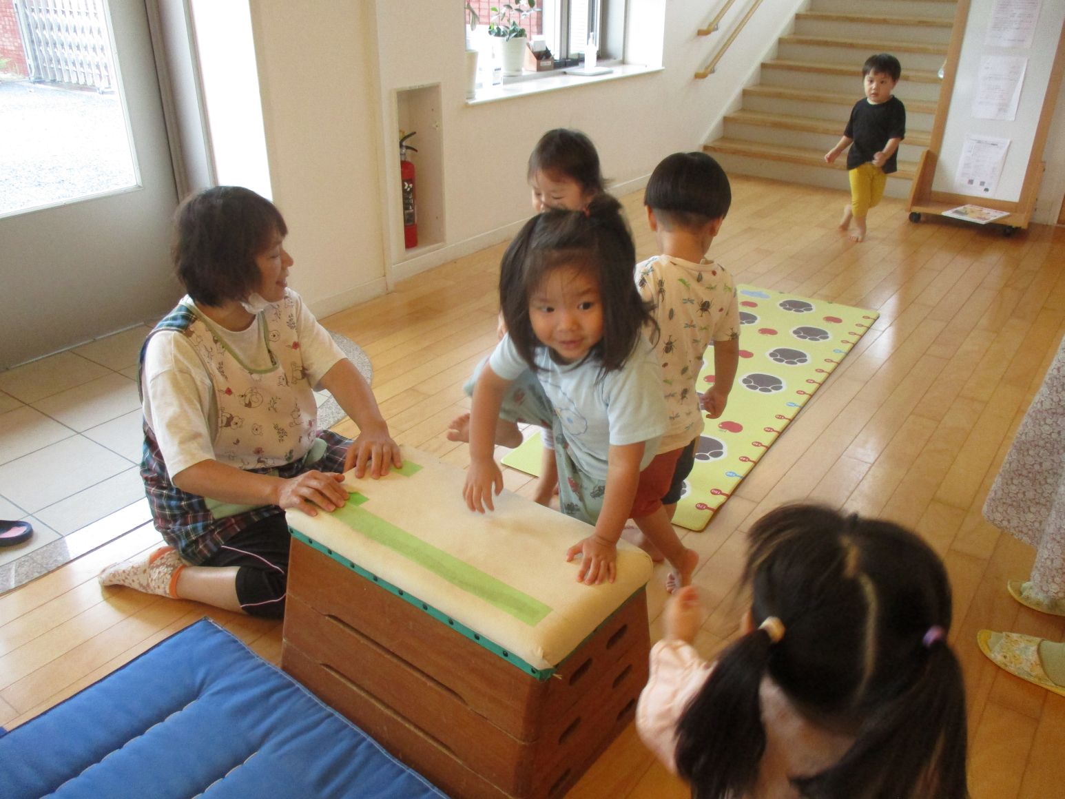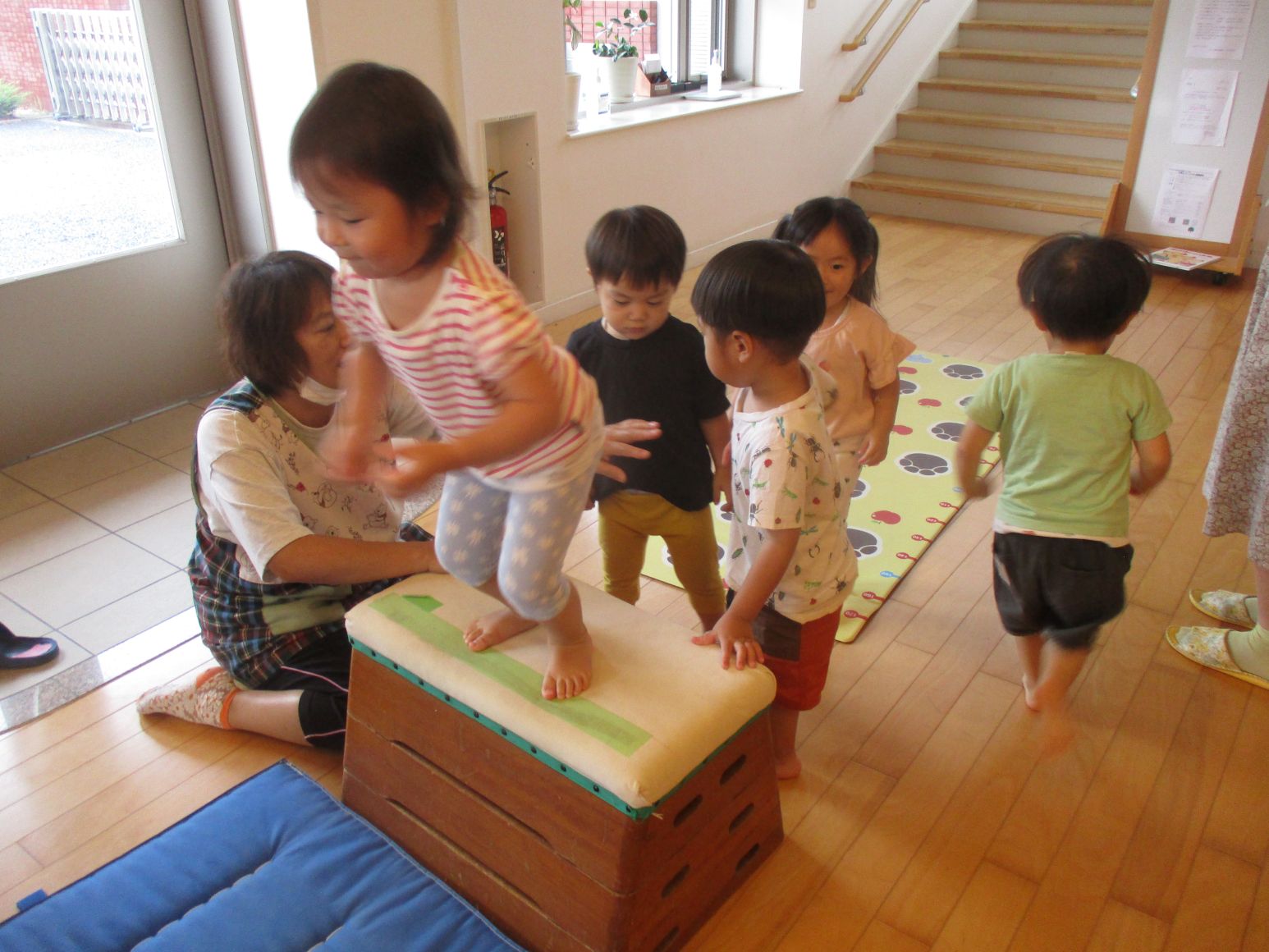 残暑が厳しい時は室内で運動あそび。高い跳び箱からジャンプできるかな?