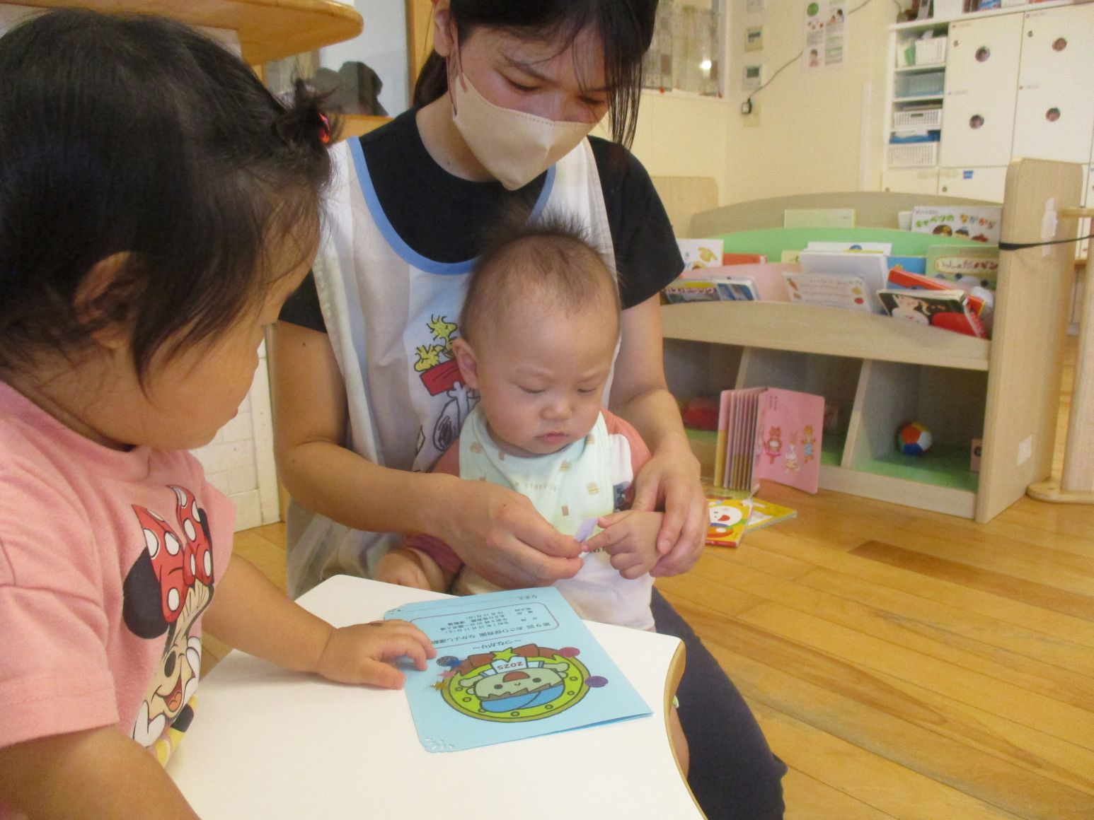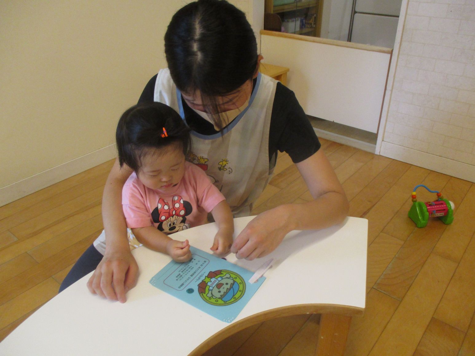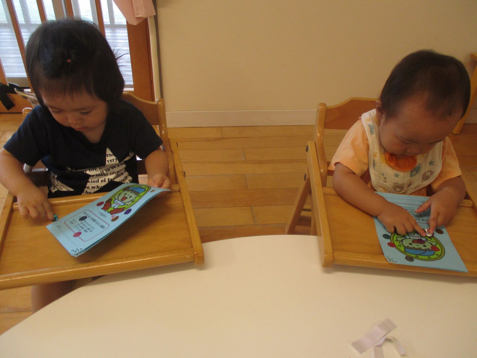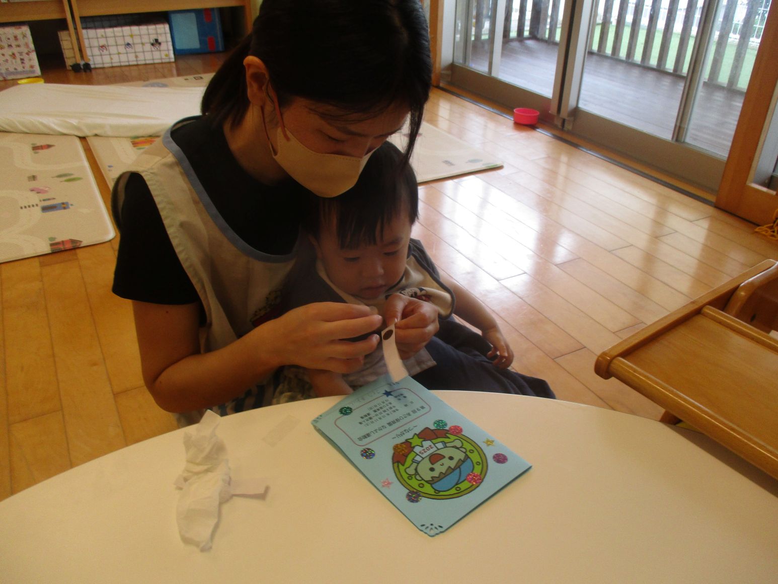 運動会のプログラムに、シールを貼っている0歳児さん。小さな指で懸命に。子どもたちが仕上げたプログラムをおうちの方に渡しました★