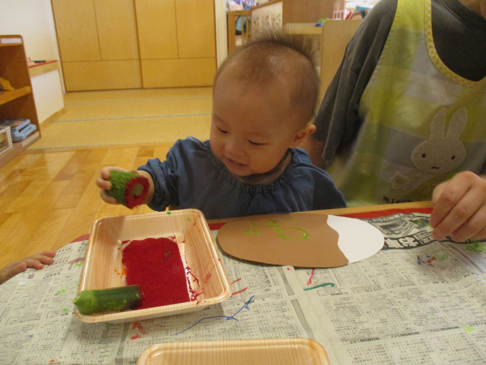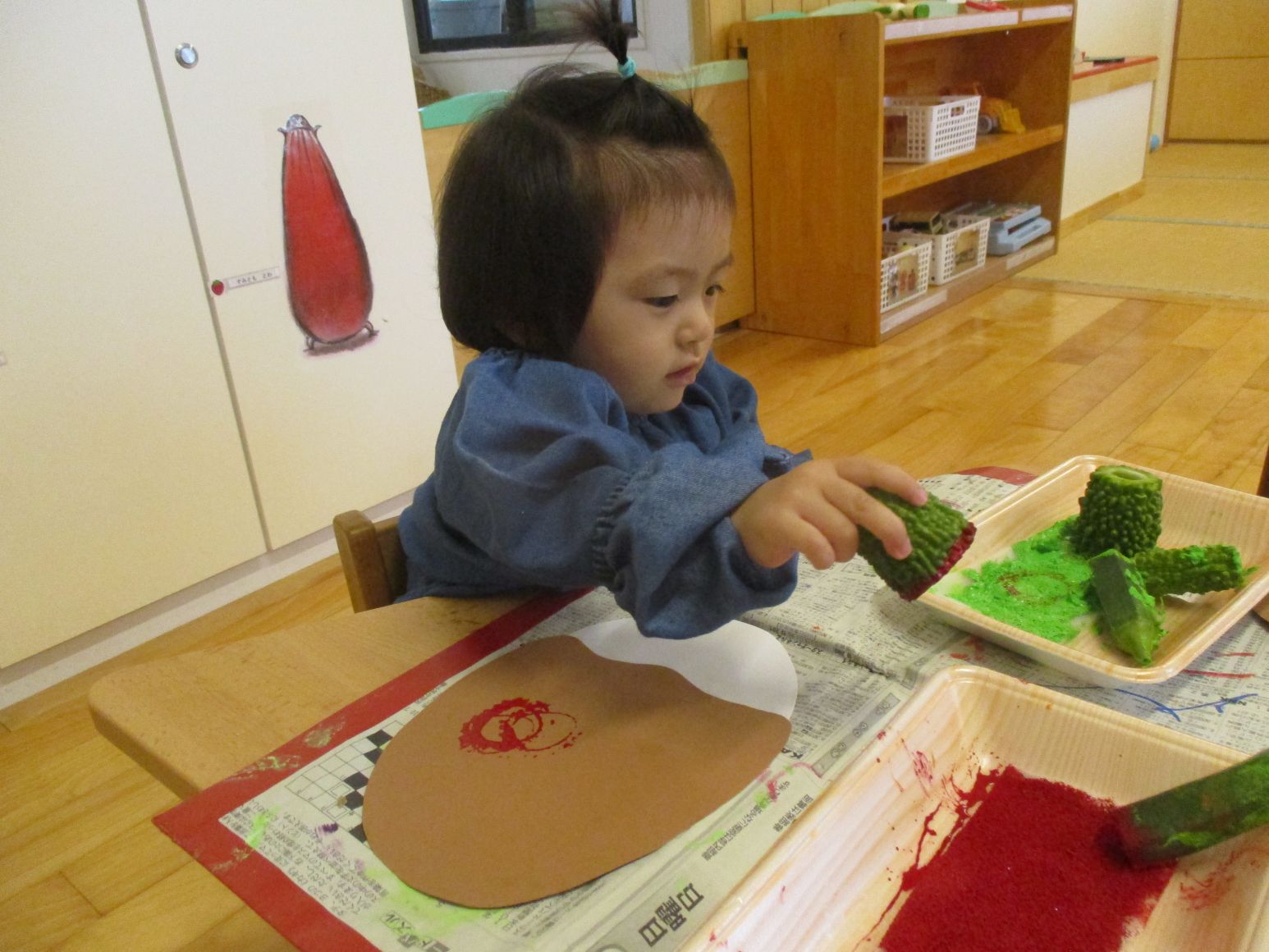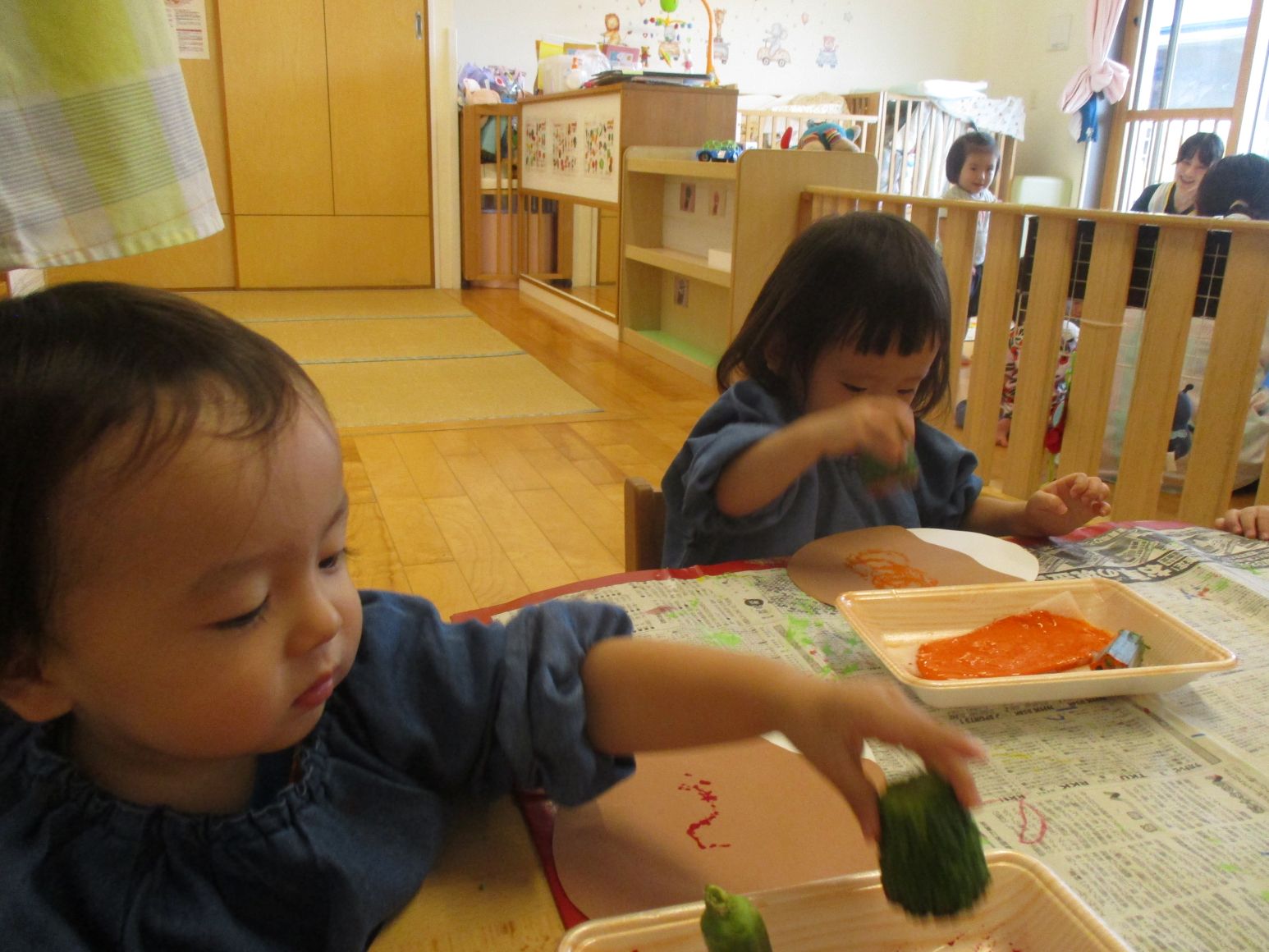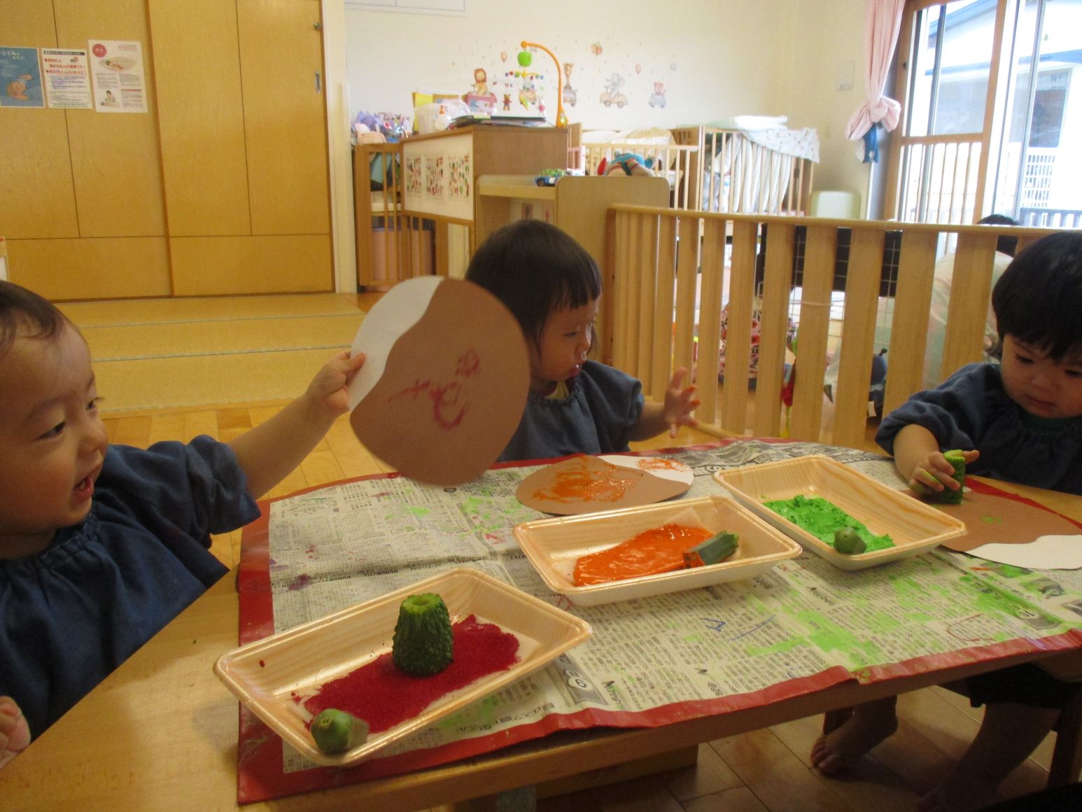 野菜を使ってスタンプや指スタンプで遊びました。何が出来るのかな?みんな夢中ですね☆