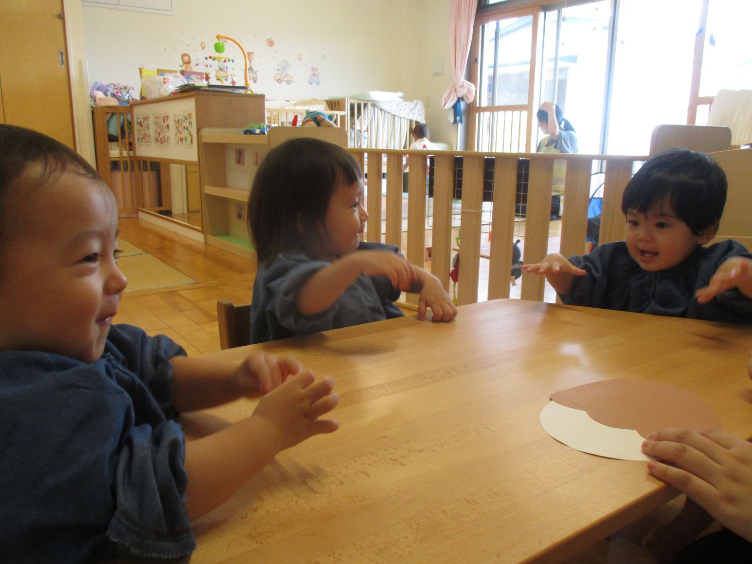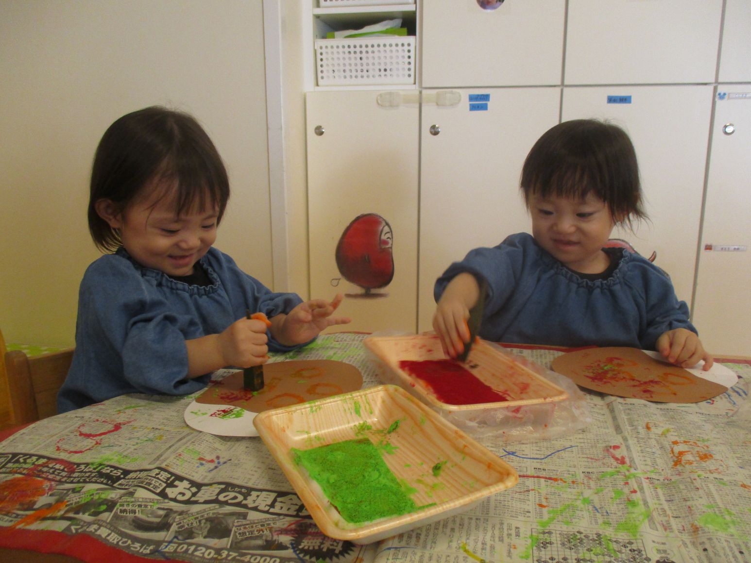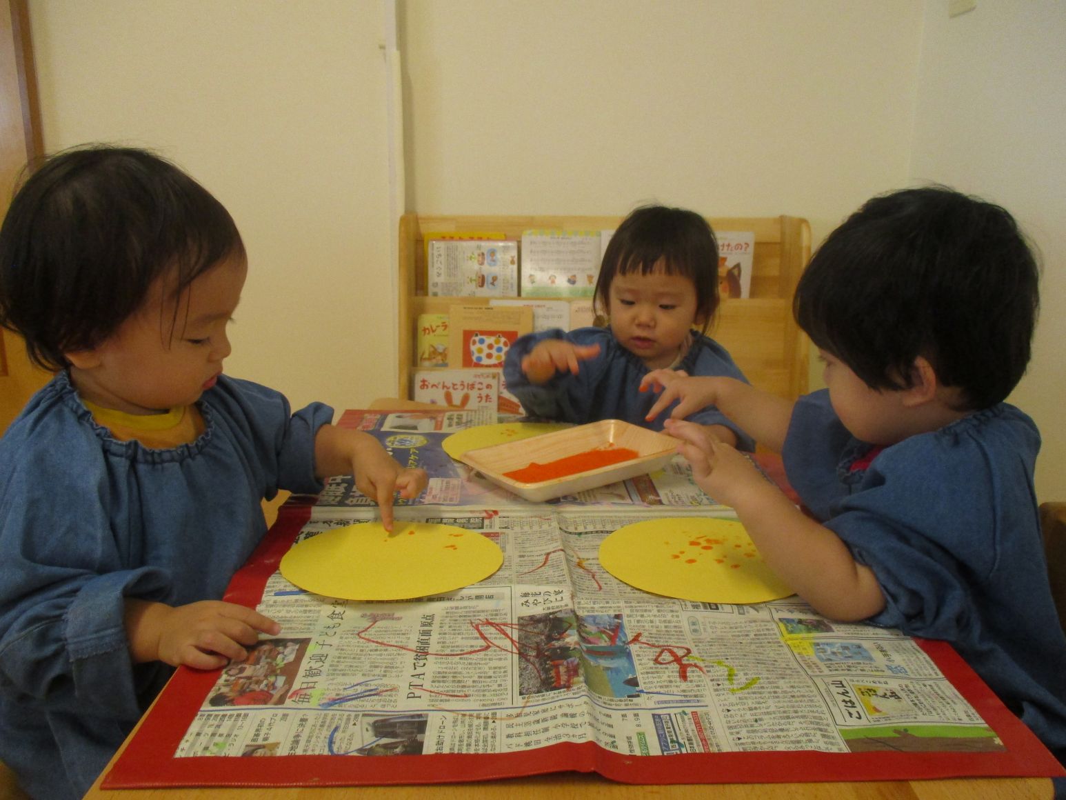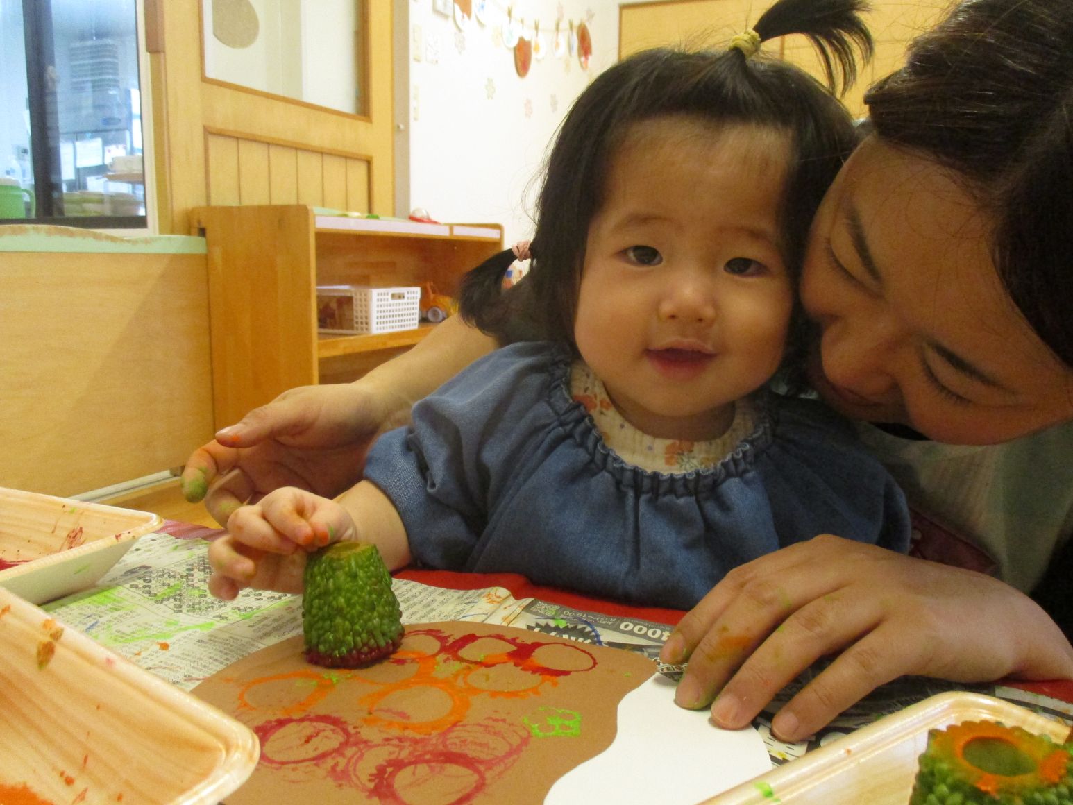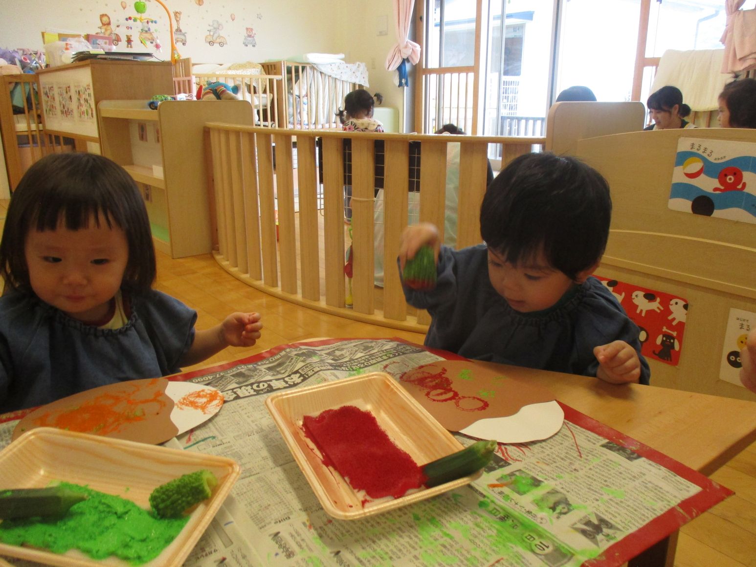 野菜を使ってスタンプや指スタンプで遊びました。何が出来るのかな?みんな夢中ですね☆